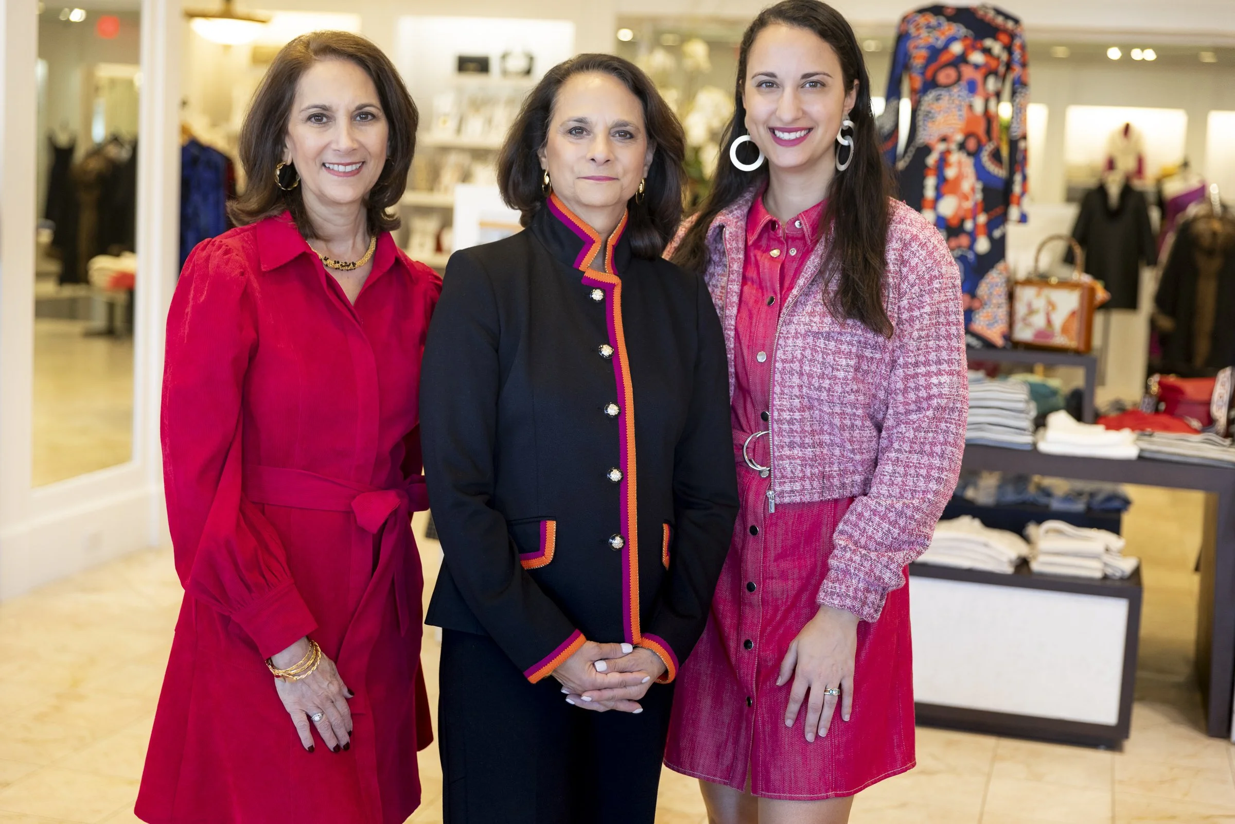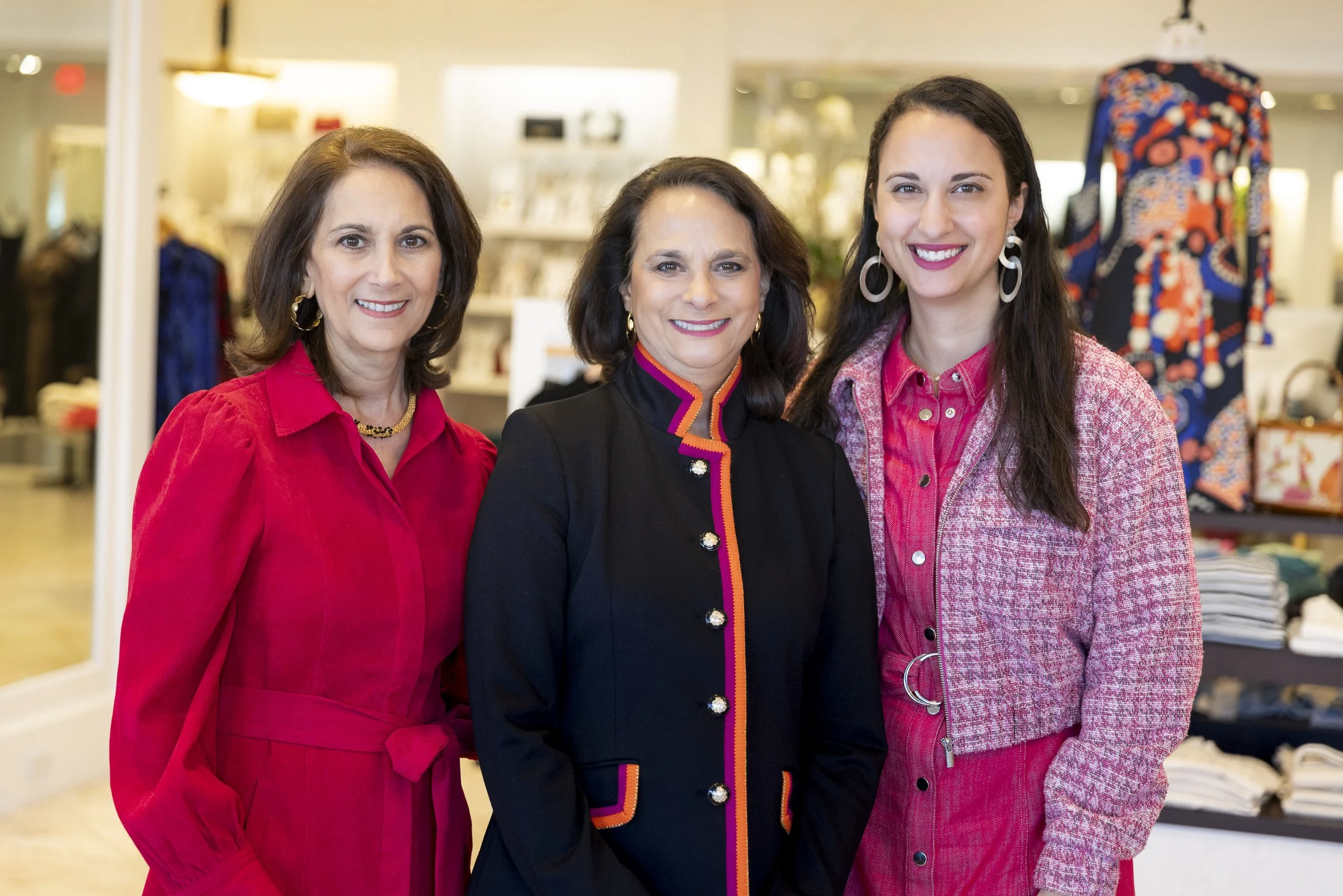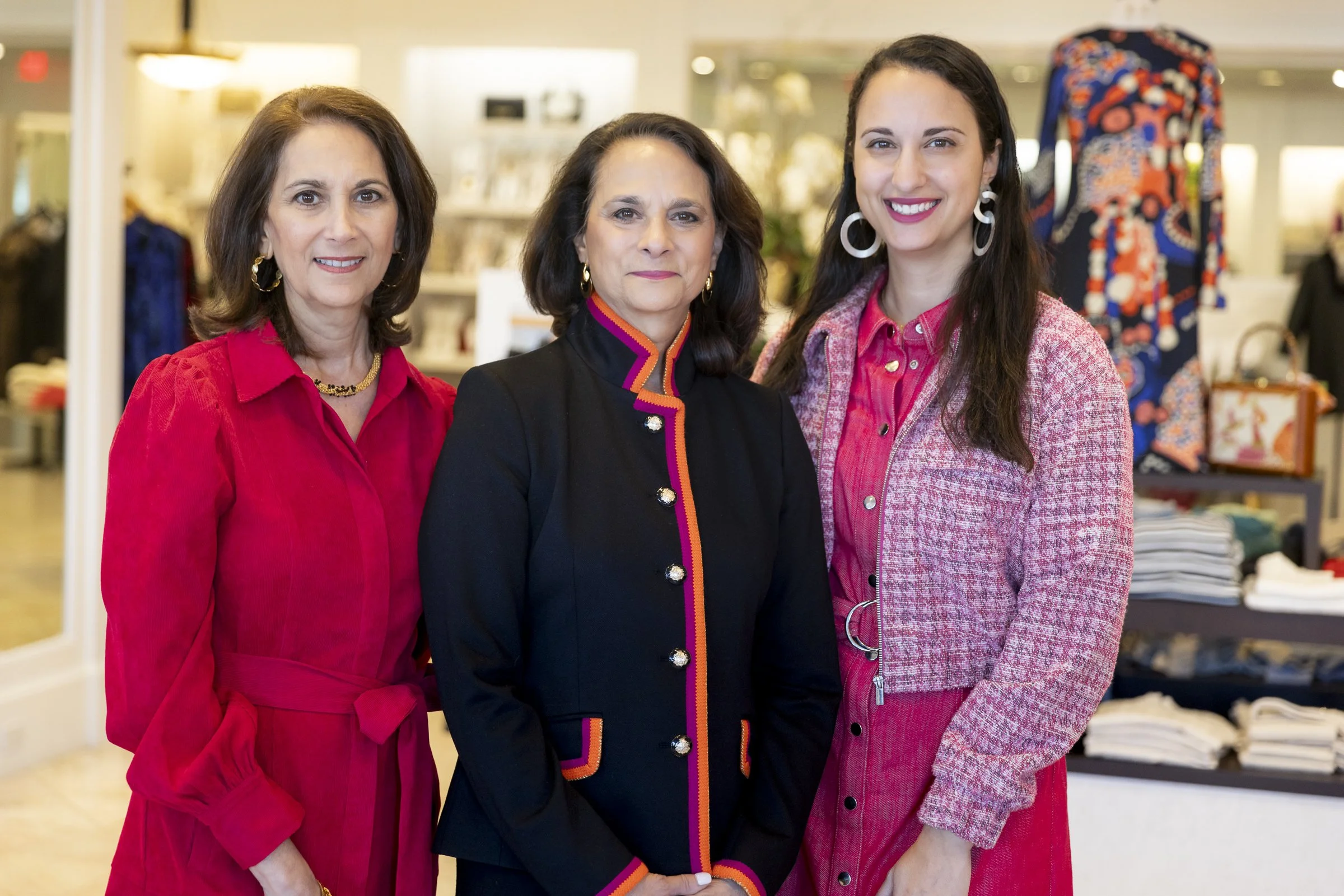 Three women standing together in a clothing store, two wearing red outfits and one in a black jacket, with shelves of clothes and accessories in the background.