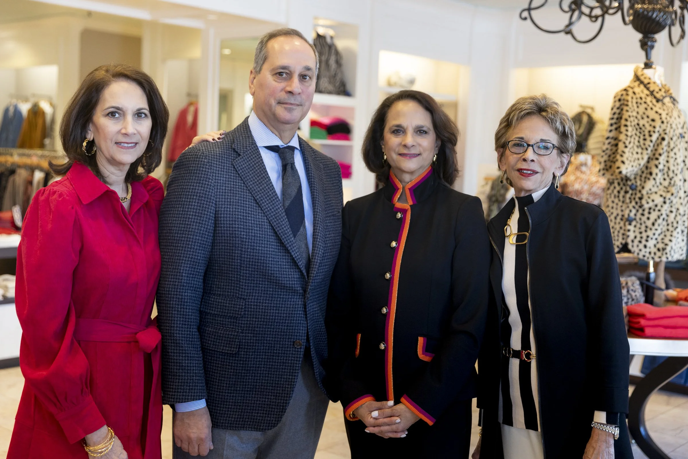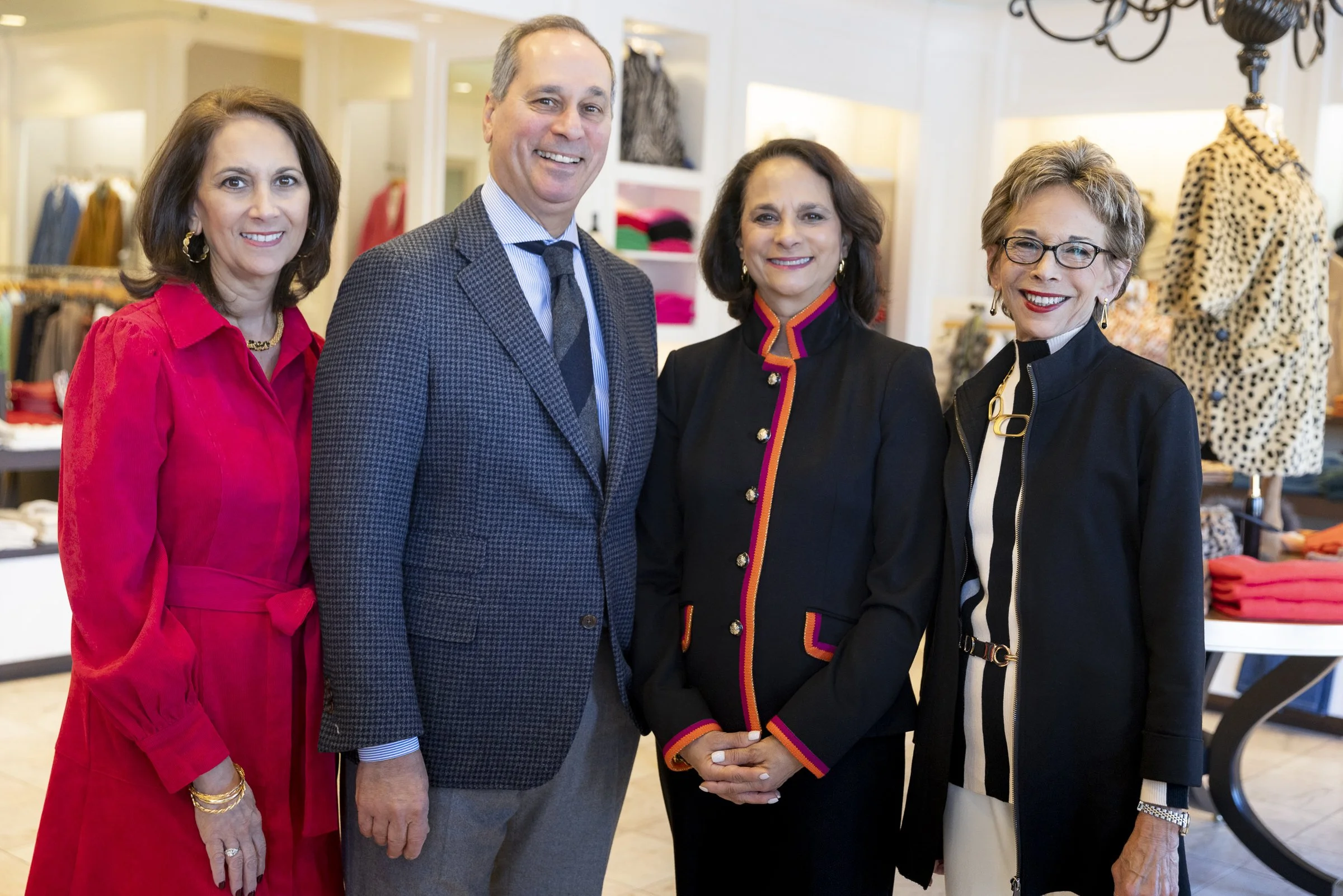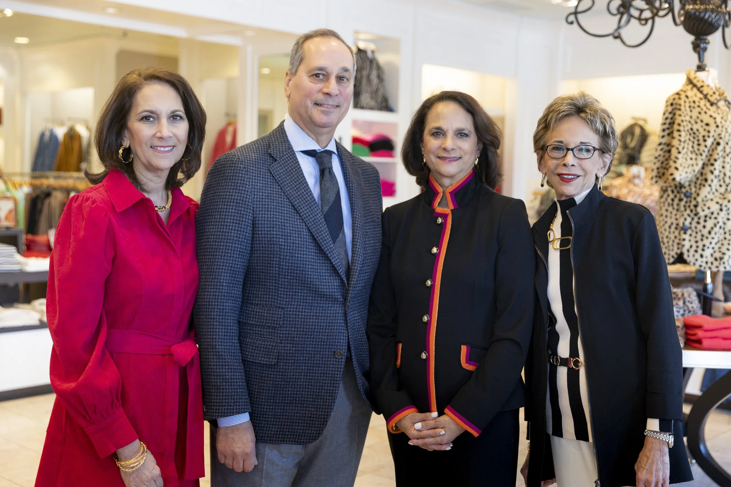 Four professionally dressed individuals posing indoors in a clothing store.