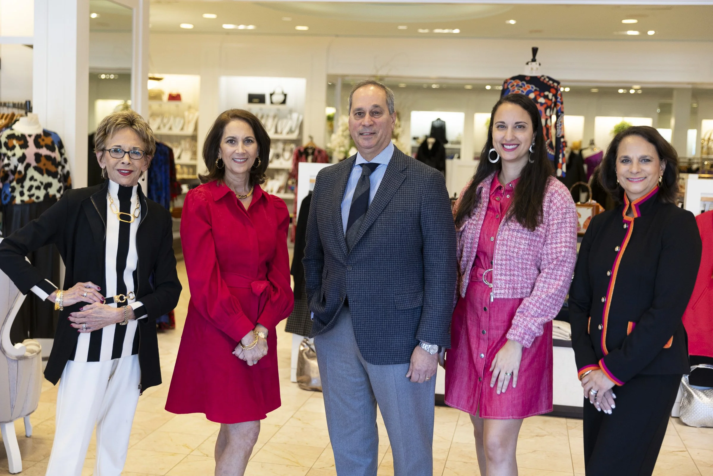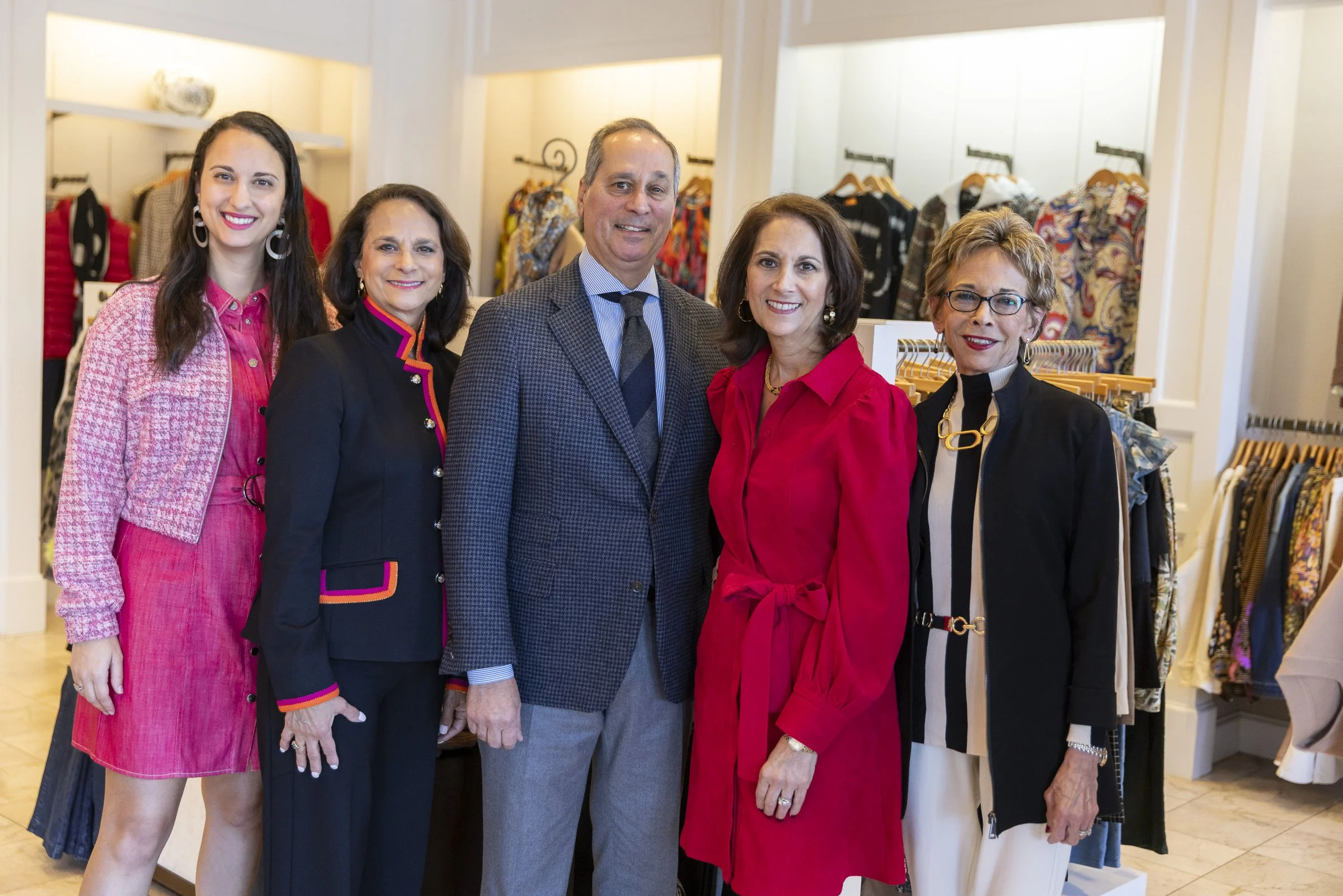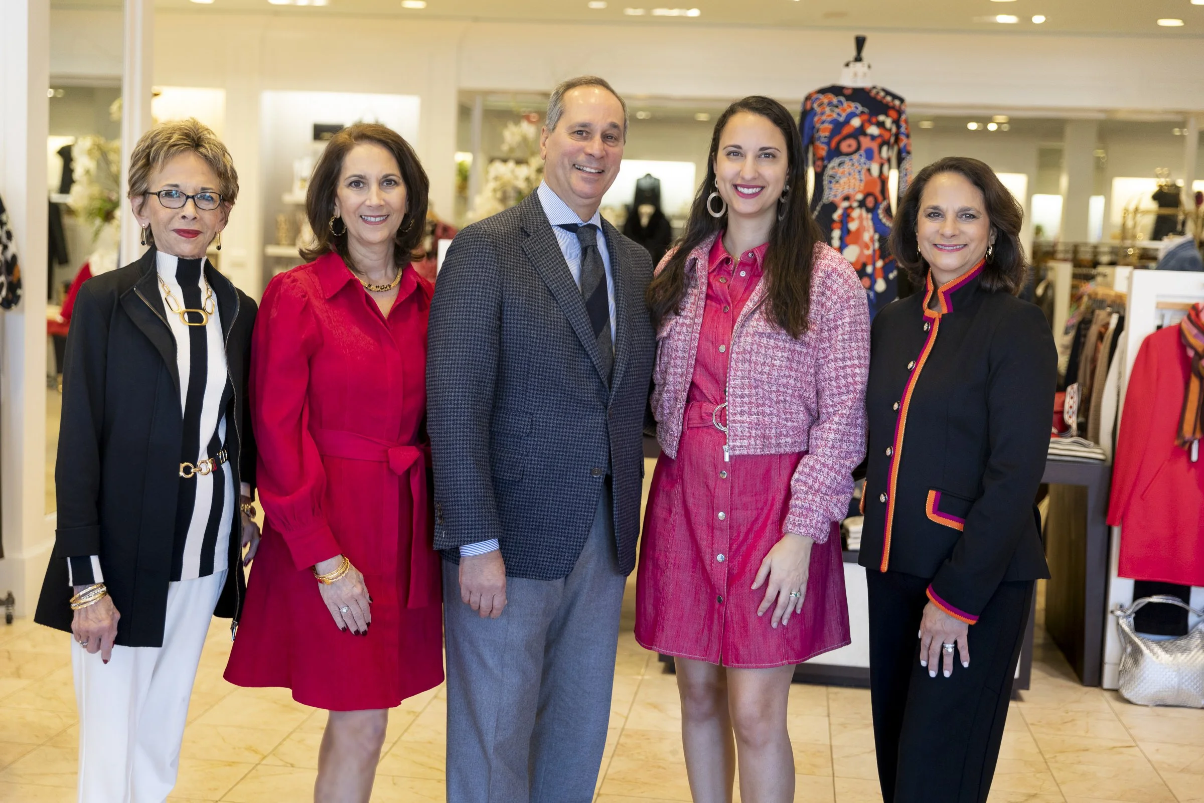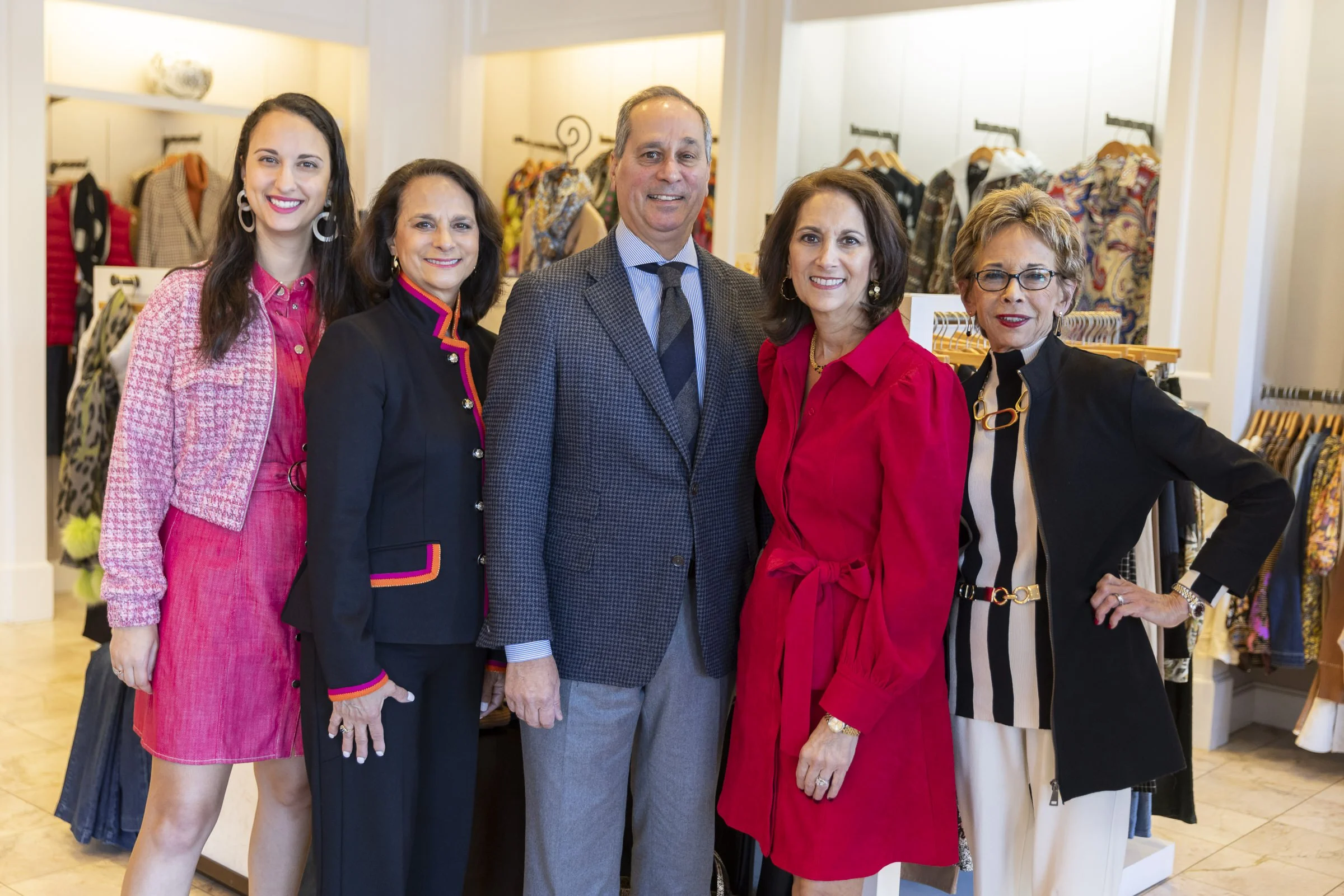 Five people posing together inside a clothing store, surrounded by racks of clothing. The group includes three women and two men, all dressed in stylish clothing. The women wear red, pink, and black outfits, while the men are in suits. The setting ap