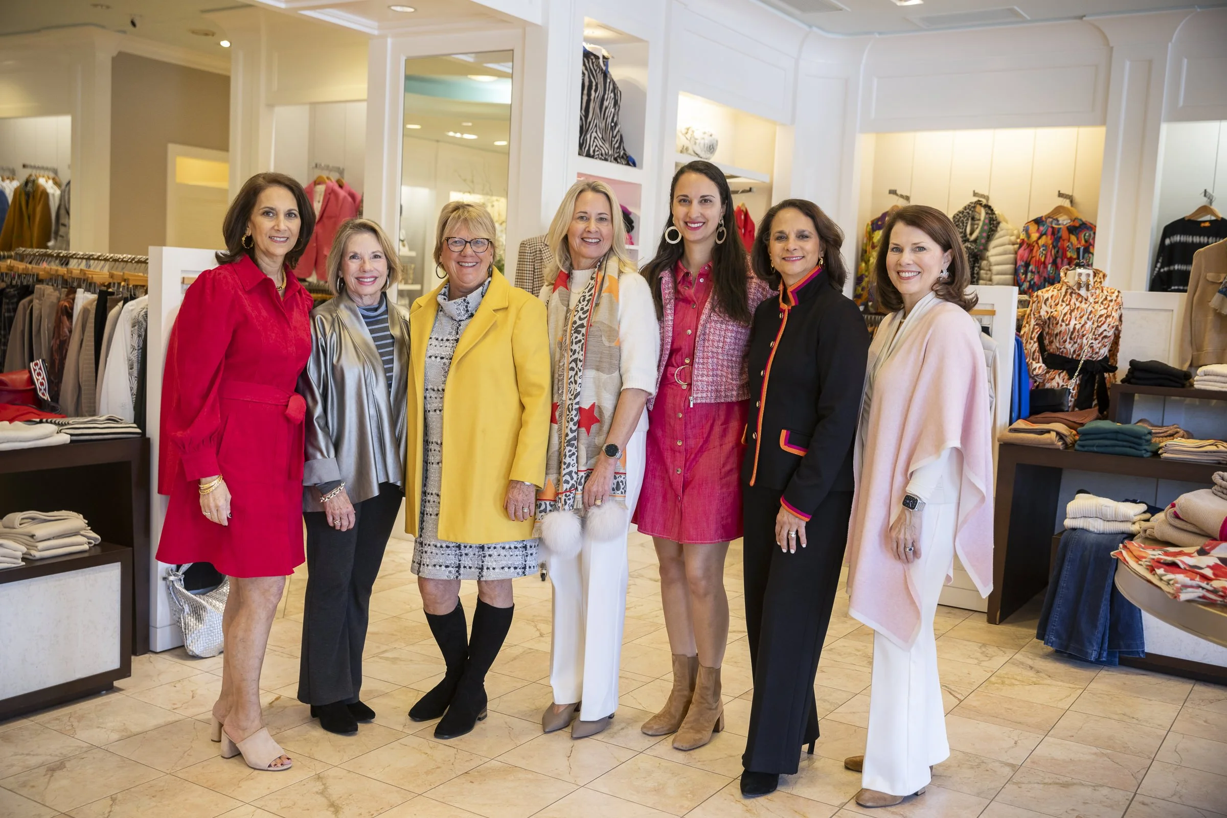 Group of seven women smiling and posing in a clothing store.