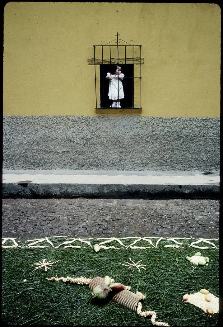 A small child in a white dress stands behind a barred window set in a yellow wall. Below, on the cobblestone street, an artistic arrangement of green grass, fruits, and vegetables forms a pattern on the ground. View fullsize