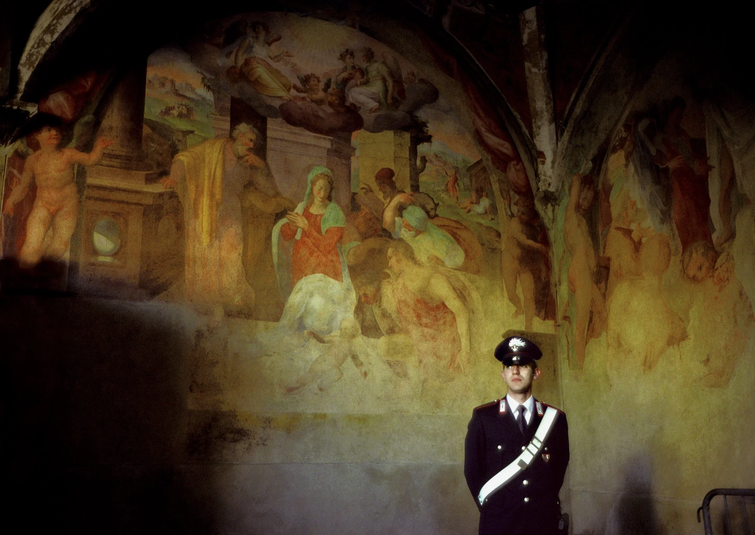 A uniformed guard stands in front of a large, classical fresco painting depicting various figures, including angels and religious imagery, on a wall.