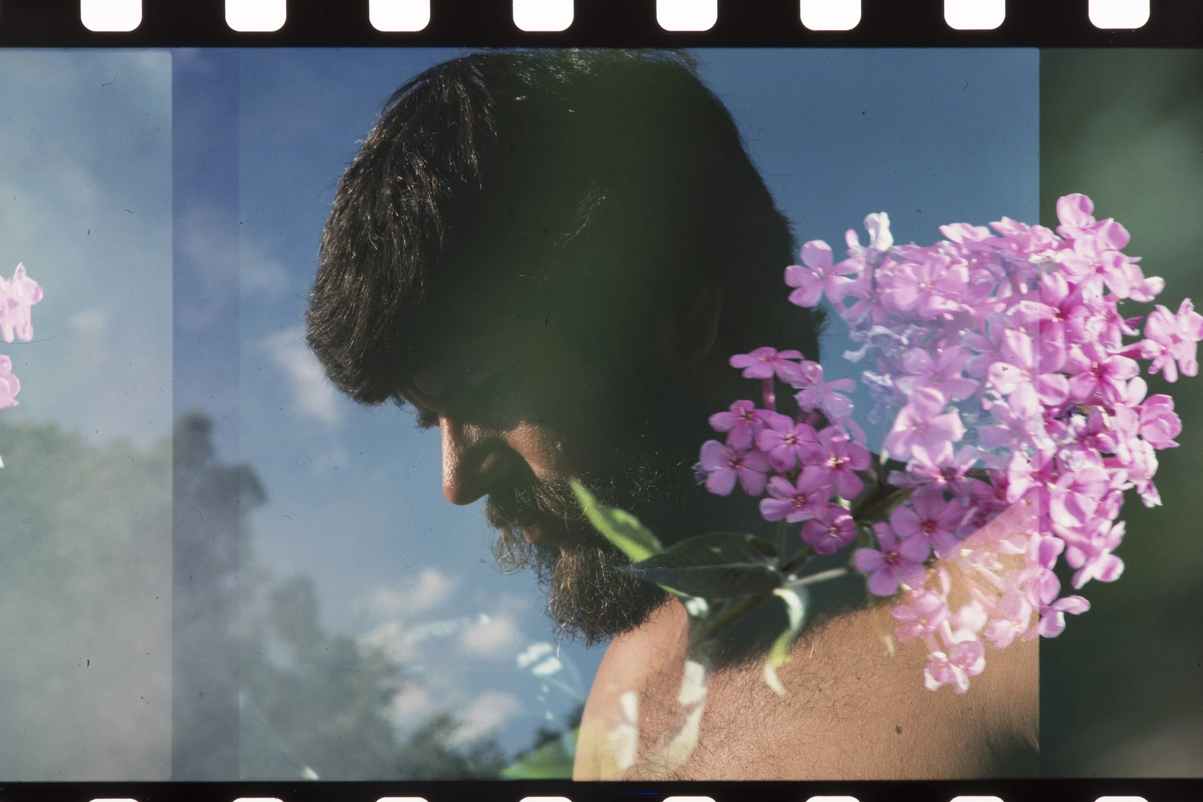 A woman standing in a field with tall grass and purple wildflowers, surrounded by trees.