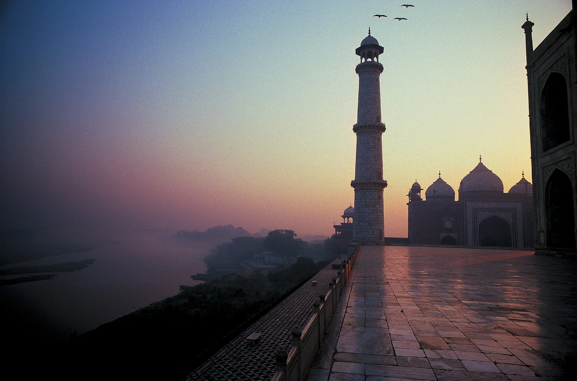 Scenic view of a mosque at sunrise with a minaret and birds flying overhead, next to a river.
