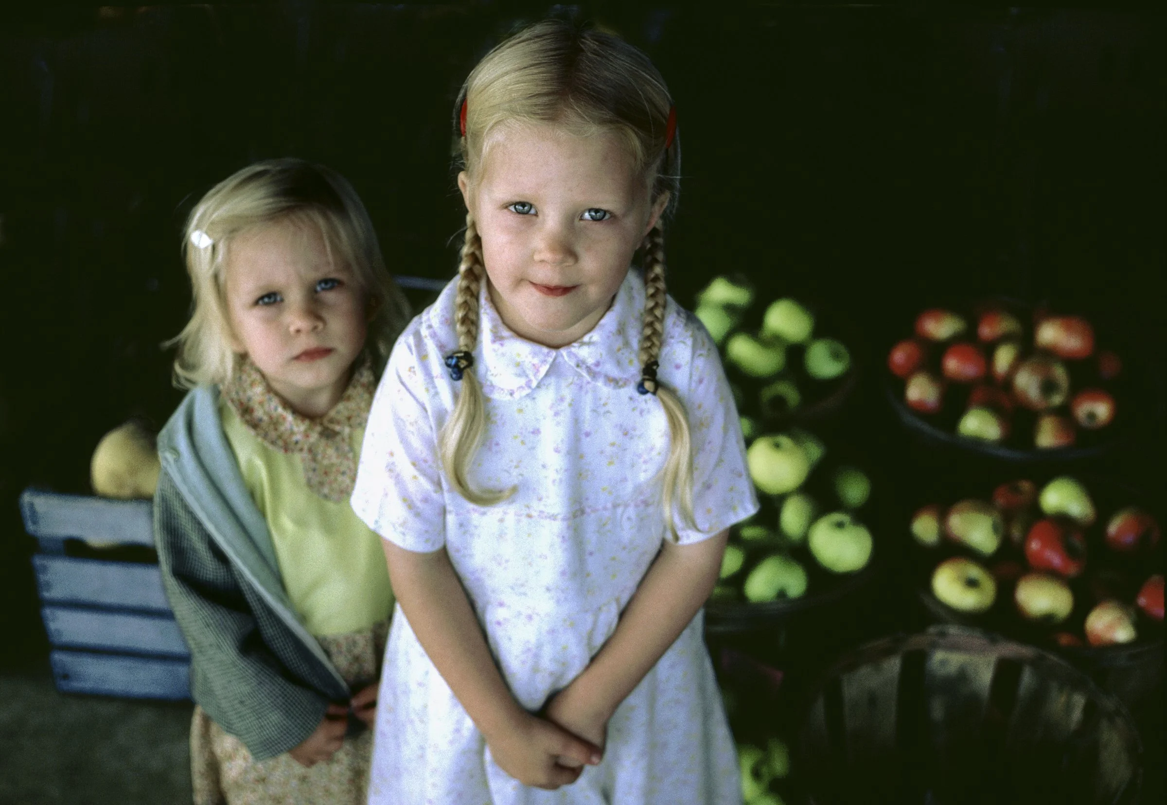 Two young girls standing in front of baskets filled with apples. View fullsize