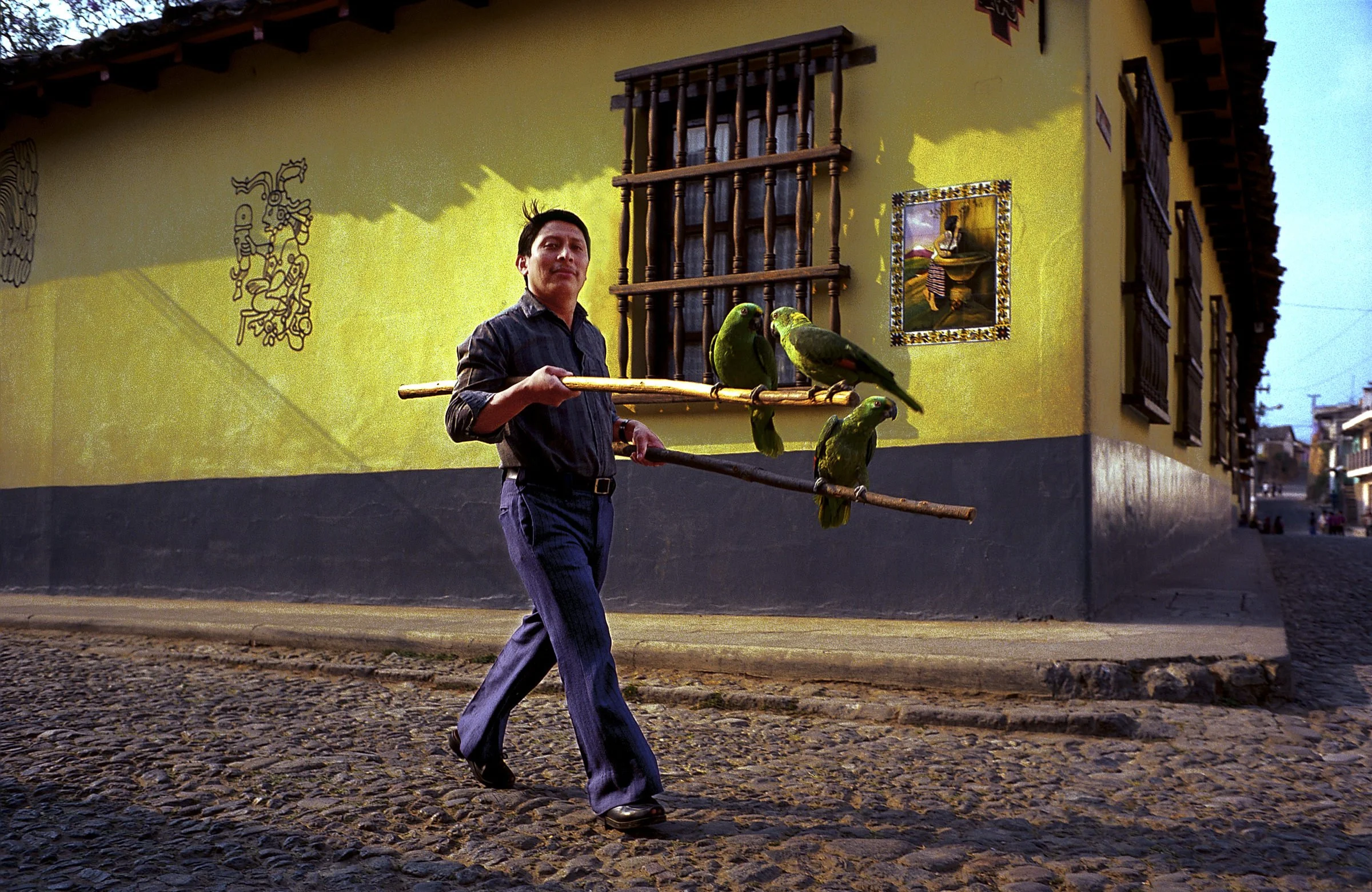 Man walking on cobblestone street carrying three green parrots on wooden sticks in front of a yellow building with barred windows and artwork.