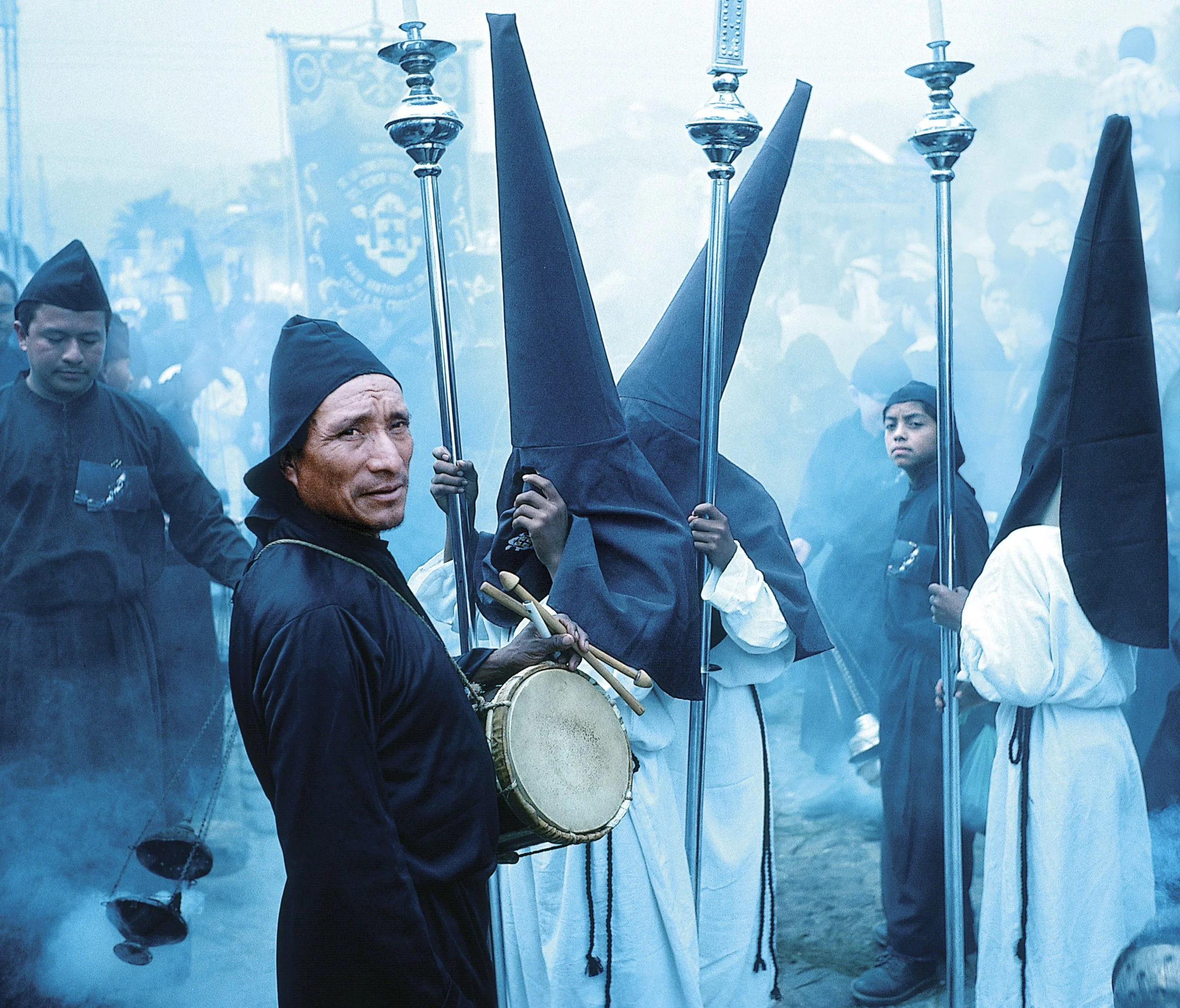 Participants in a religious procession wearing black and white robes with pointed hoods, surrounded by smoke, one carrying a drum.