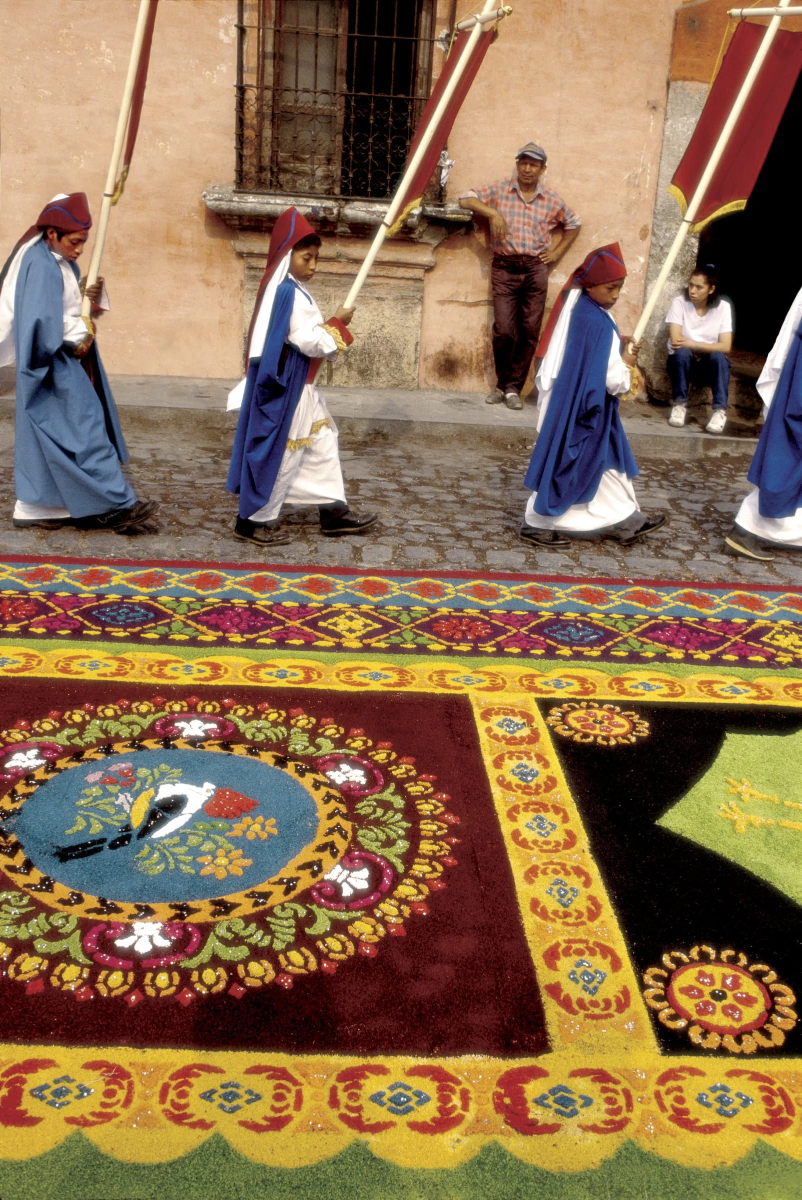 People in ceremonial attire walking on a colorful sawdust carpet during a parade