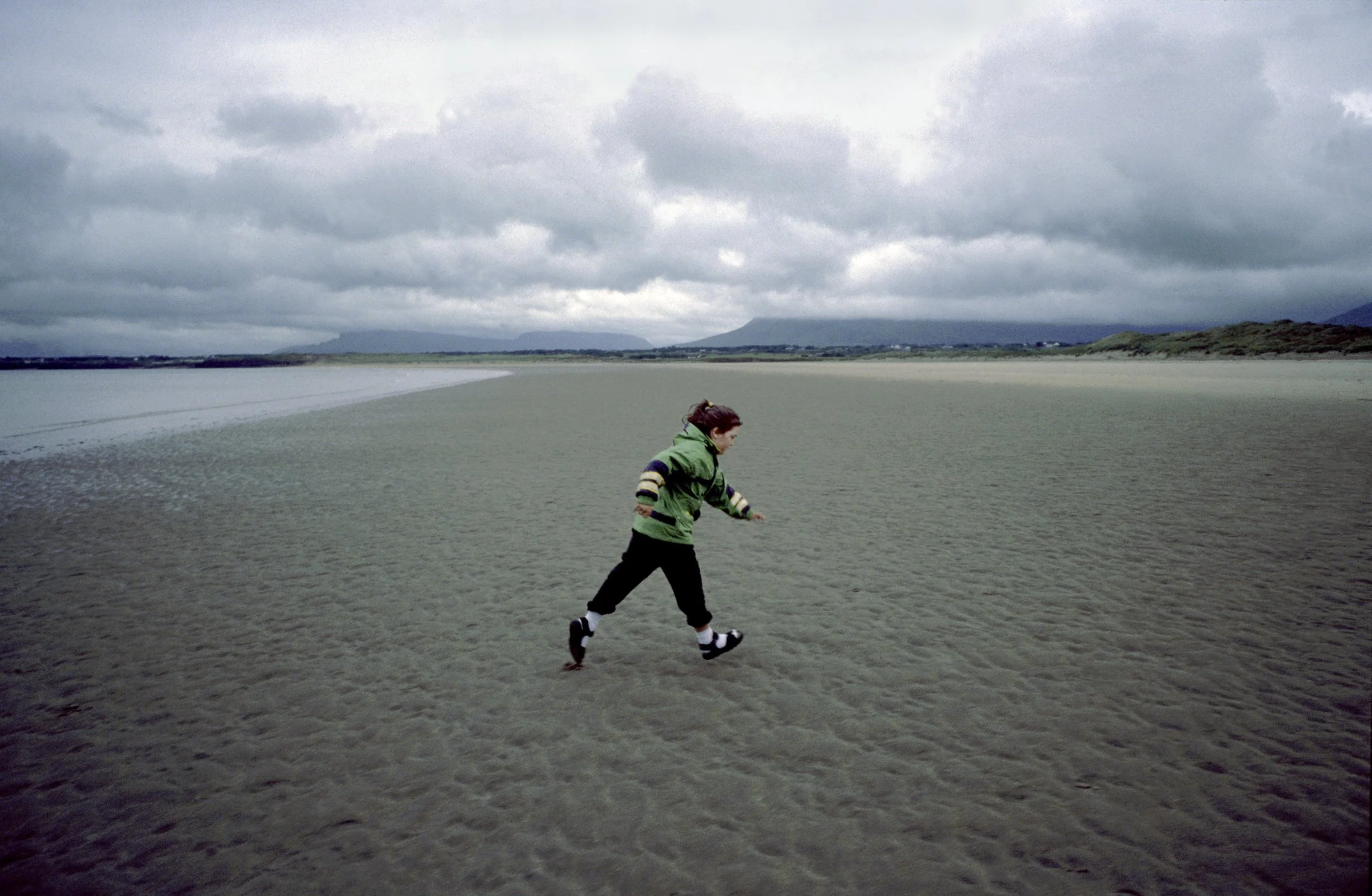 Blurry image of a person wearing red and a child in dark clothing walking hand in hand in a bright, overexposed setting.