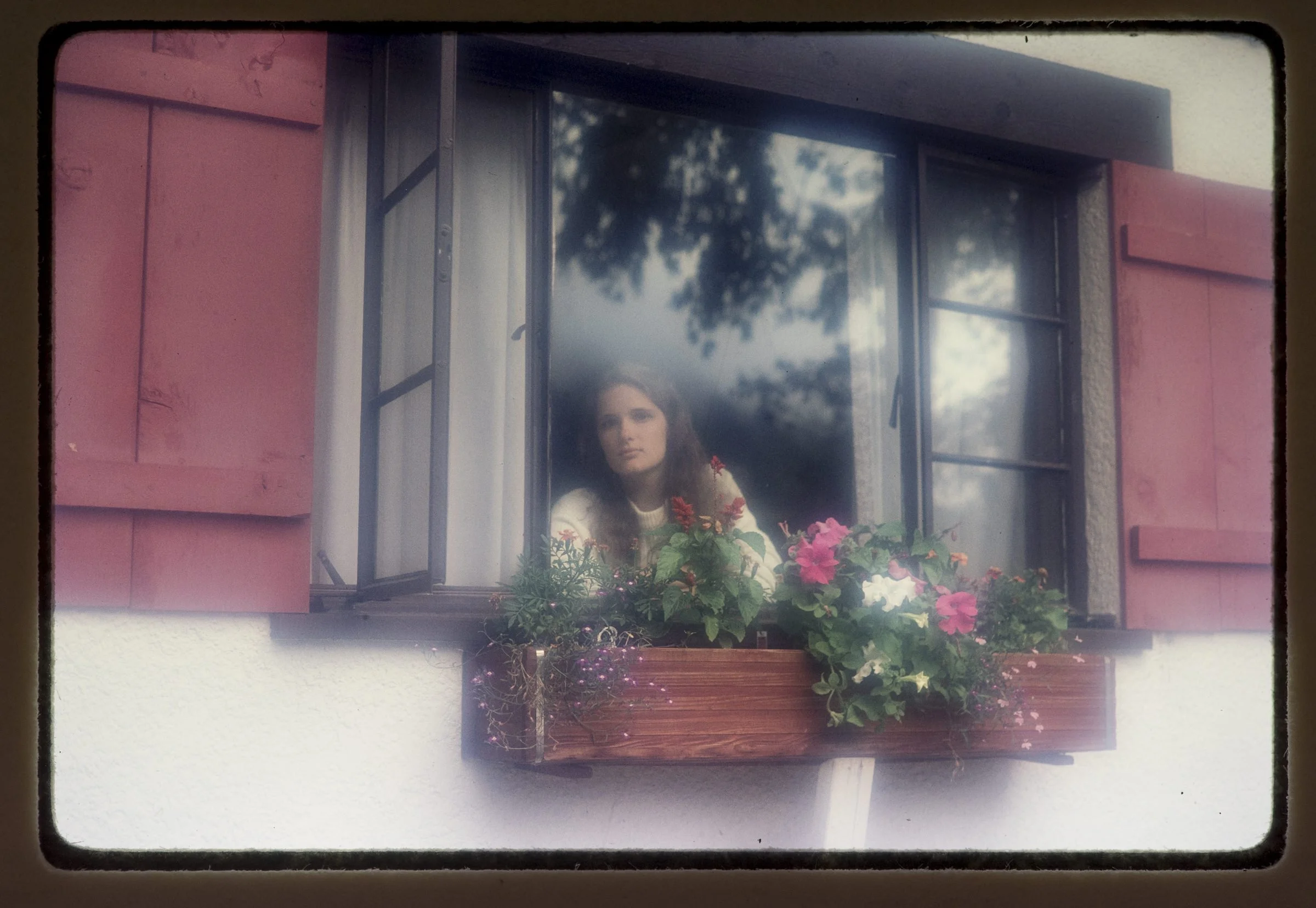 A woman looking out of an open window framed by red shutters with a wooden flower box filled with colorful flowers. View fullsize