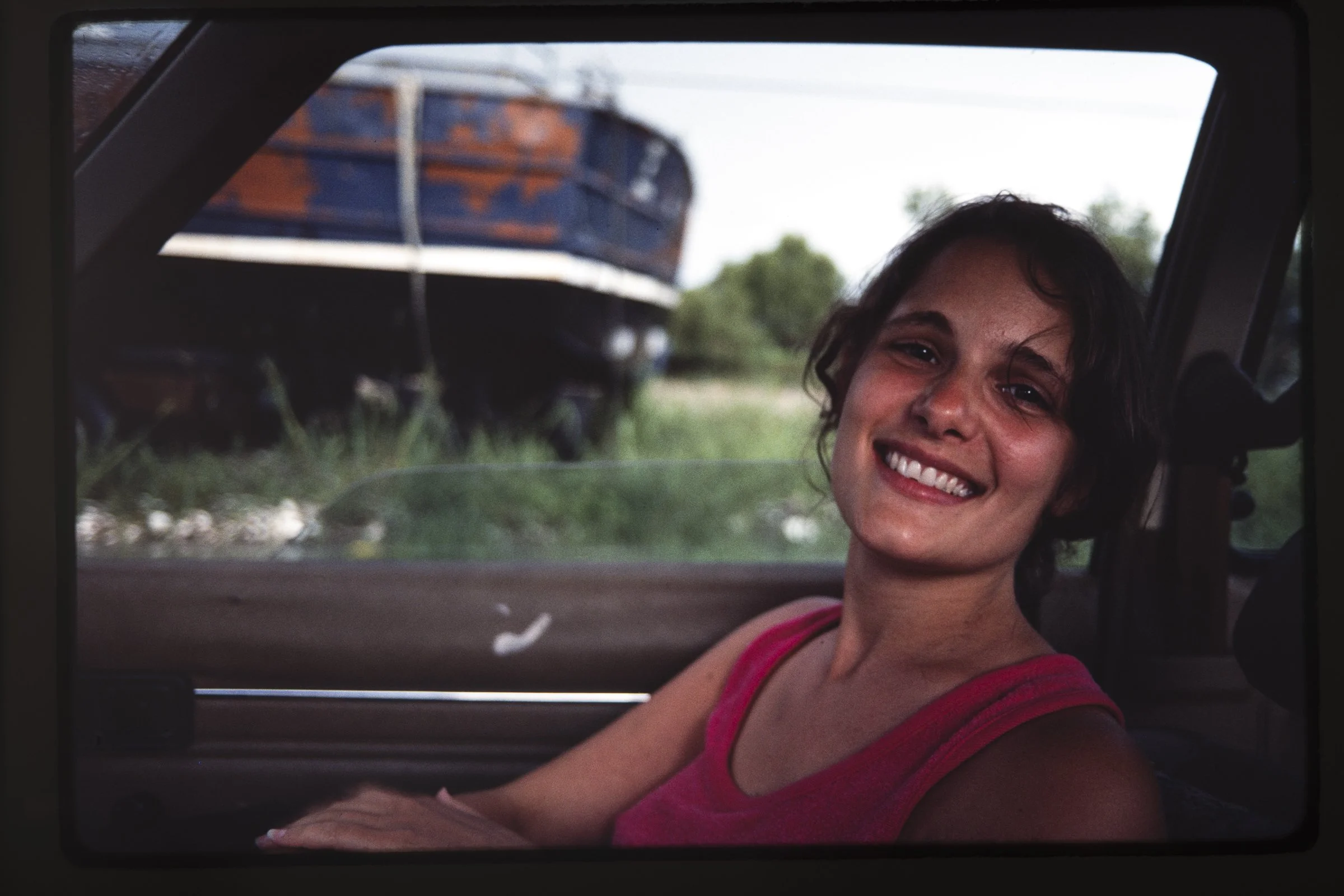 Smiling person in a car with a rusted boat in the background. View fullsize