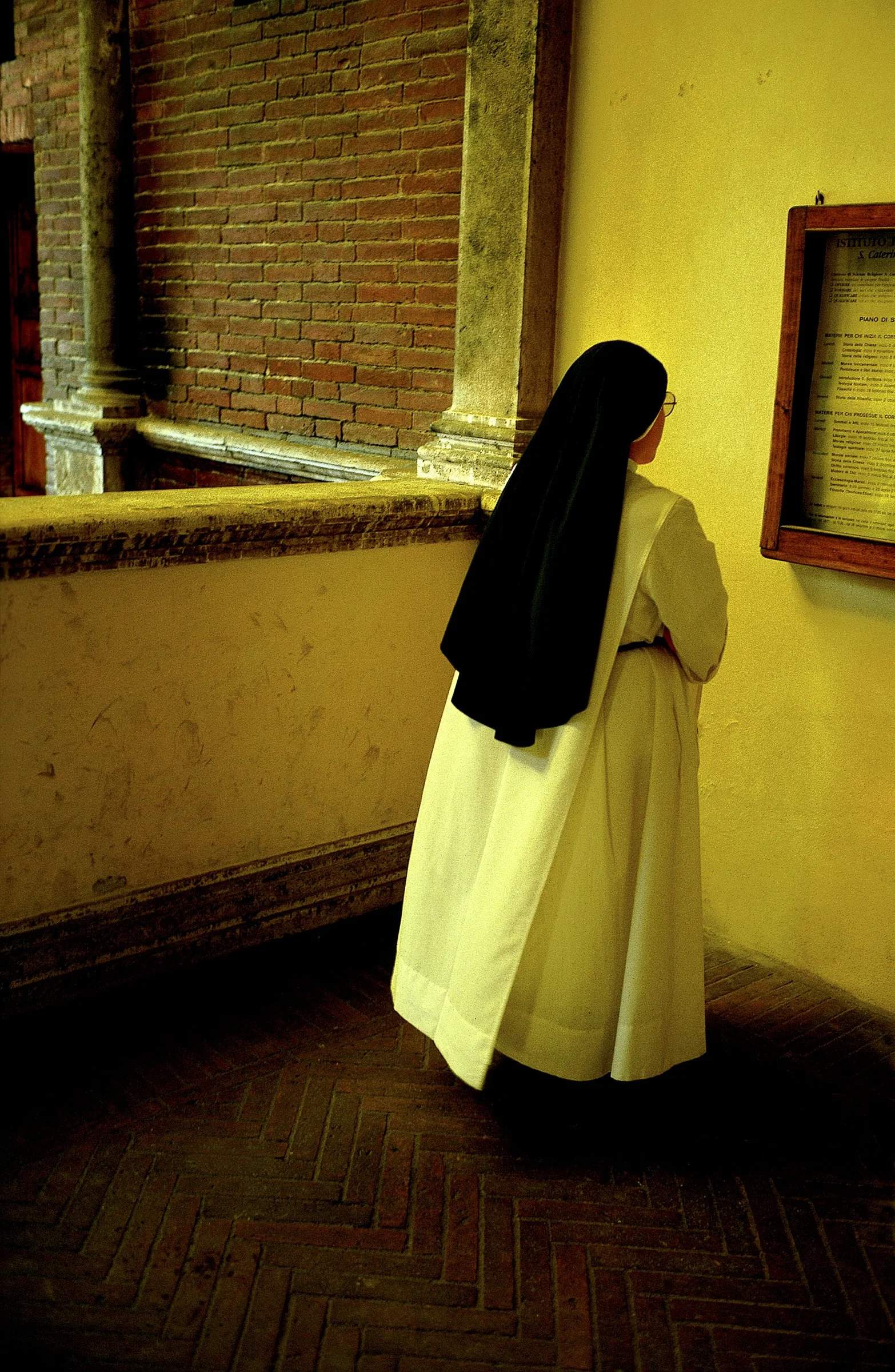 A nun in a white habit and black veil stands in a corridor with brick walls, looking at a framed notice on a yellow wall. View fullsize