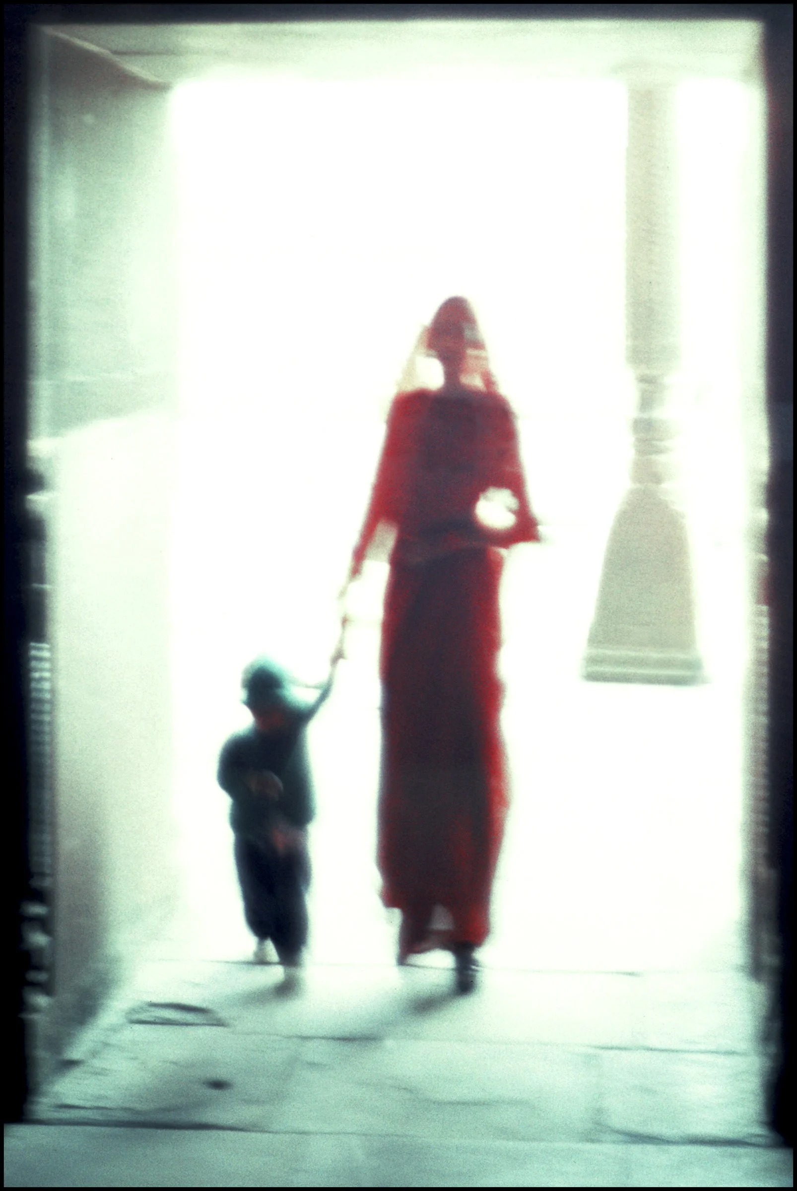 Blurry image of a person wearing red and a child in dark clothing walking hand in hand in a bright, overexposed setting. View fullsize