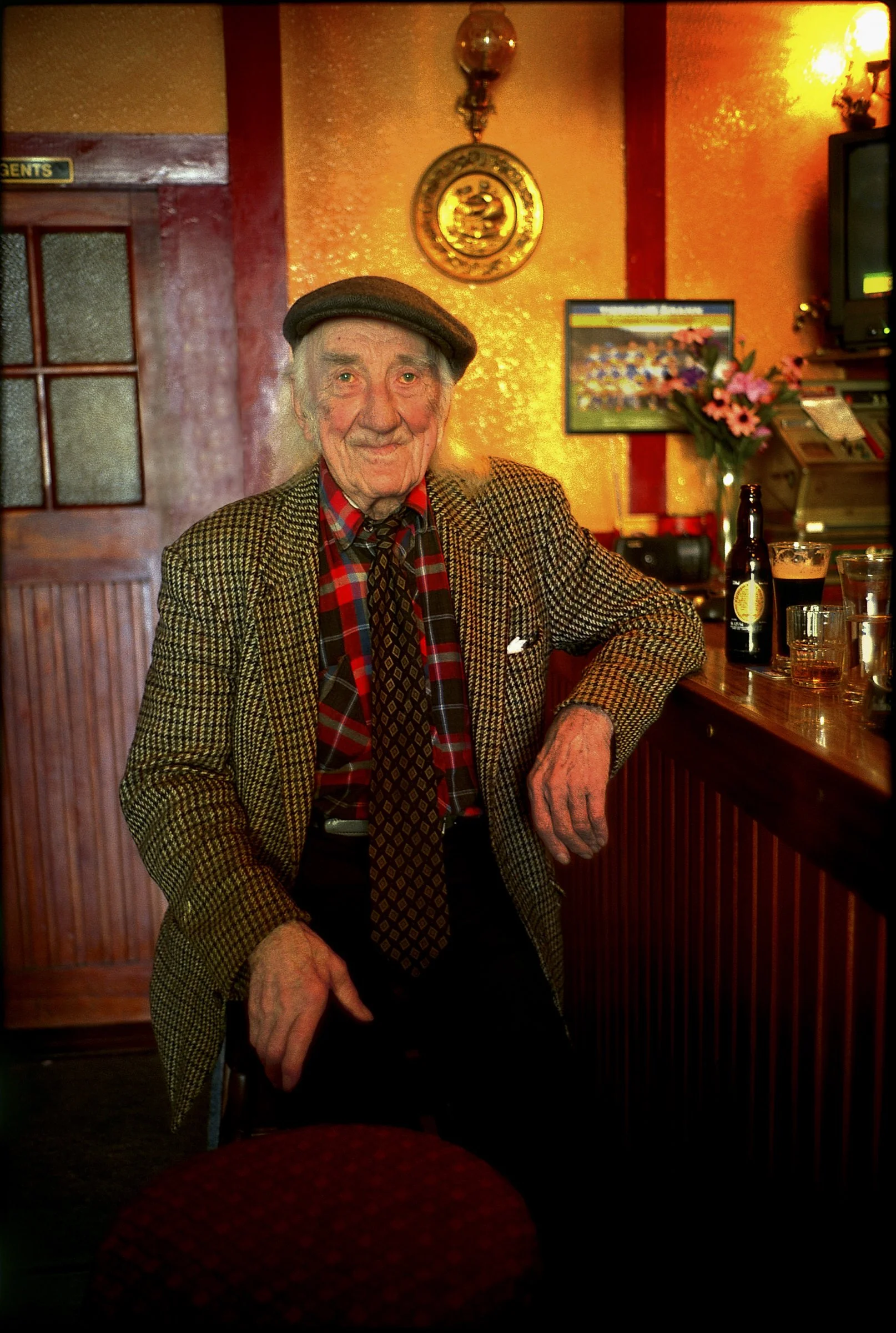 Elderly man in a pub wearing a plaid jacket, red and black plaid shirt, patterned tie, and flat cap, standing by a bar with various drinks. View fullsize