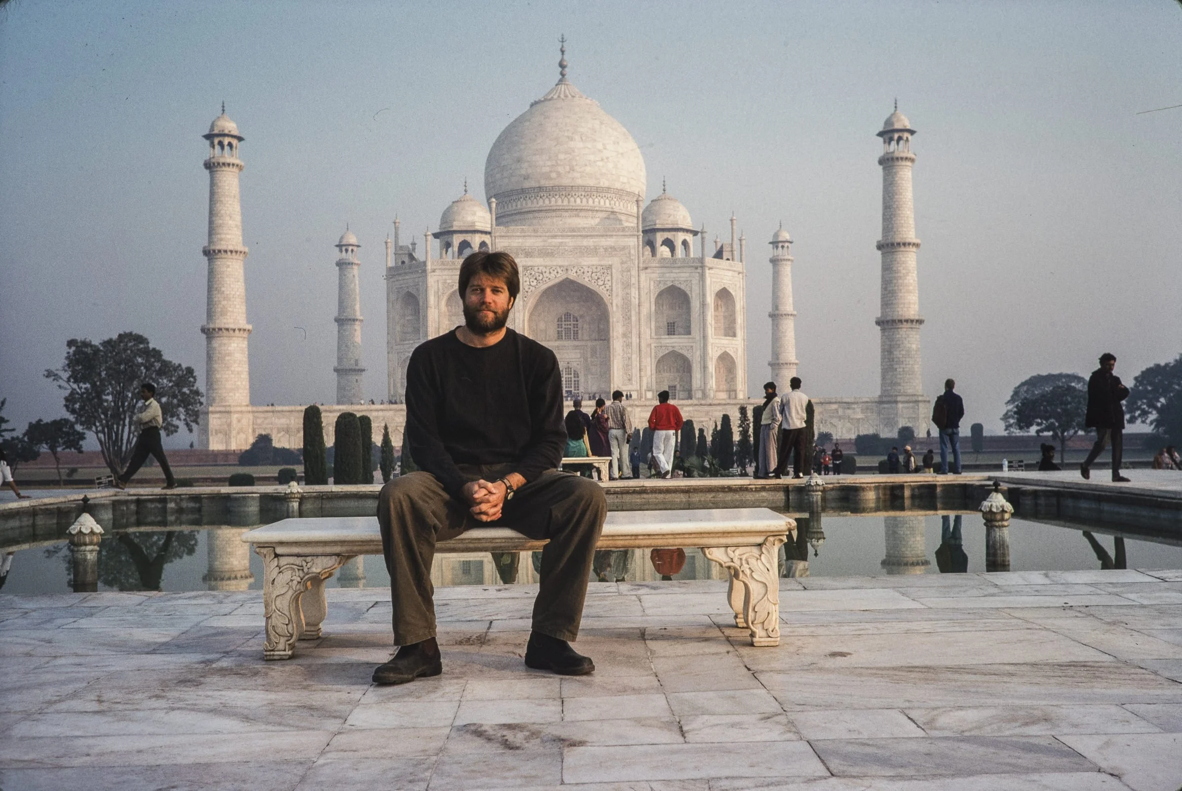 Person sitting on a bench in front of the Taj Mahal in India, with tourists walking by and the iconic mausoleum in the background.