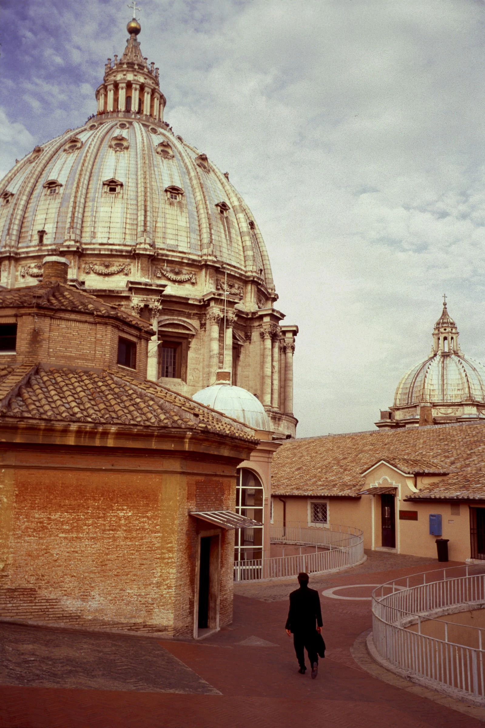 View of St. Peter's Basilica dome and Vatican rooftops with a person walking, Vatican City.