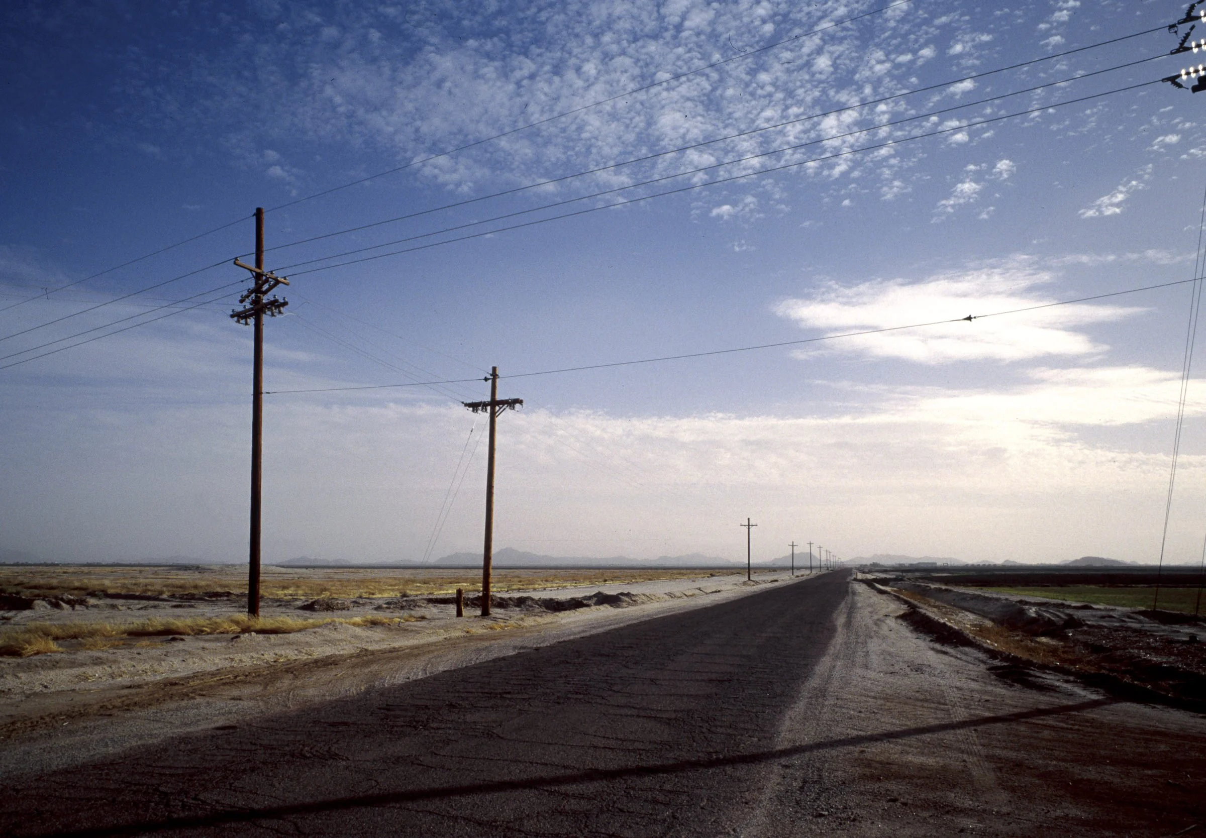 Desert road with utility poles under a blue sky with clouds. View fullsize