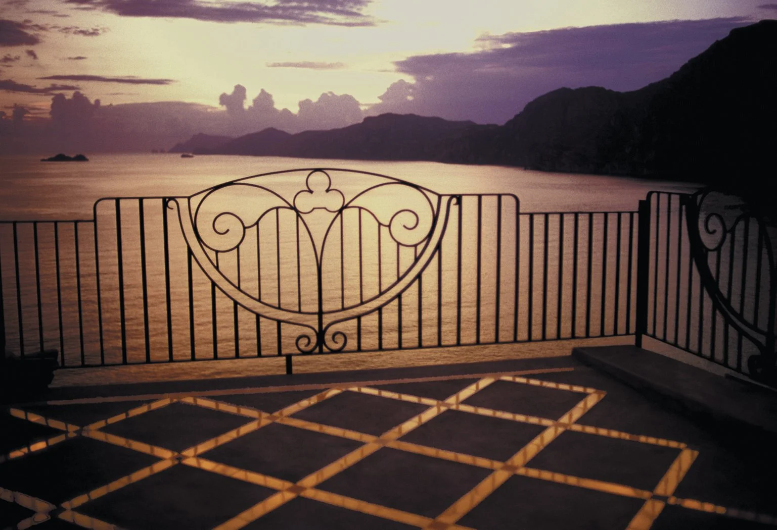 Terrace with ornate railing overlooking ocean at sunset, with mountains and clouds in the background. View fullsize