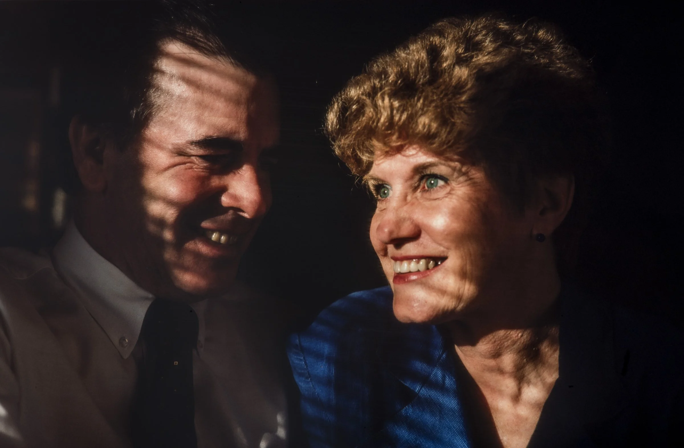 Two people smiling at each other, with sunlight casting stripes on their faces.