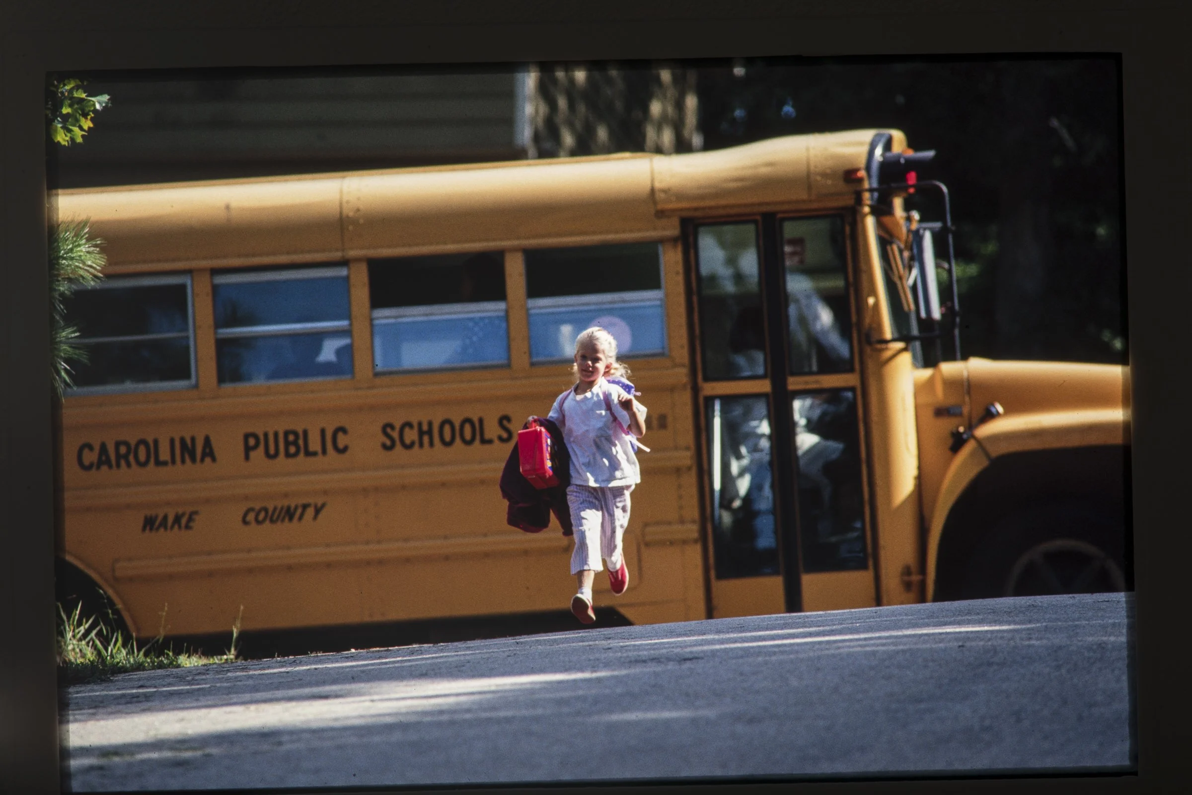 Child running from a parked yellow school bus labeled "Carolina Public Schools" in Wake County. View fullsize