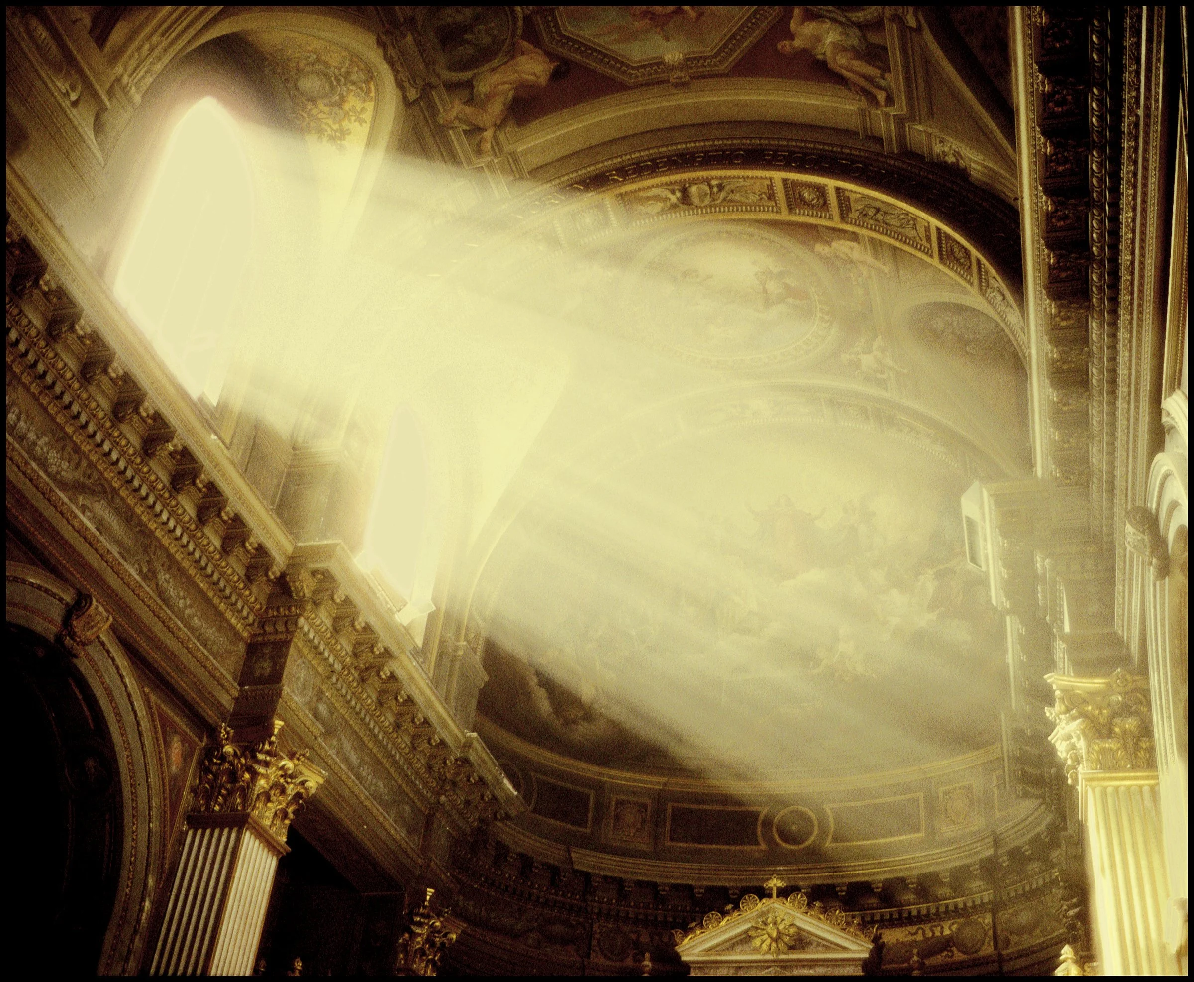 Sunlight streaming through a window in an ornate cathedral interior, illuminating frescoes and detailed architectural elements like columns and arches. View fullsize