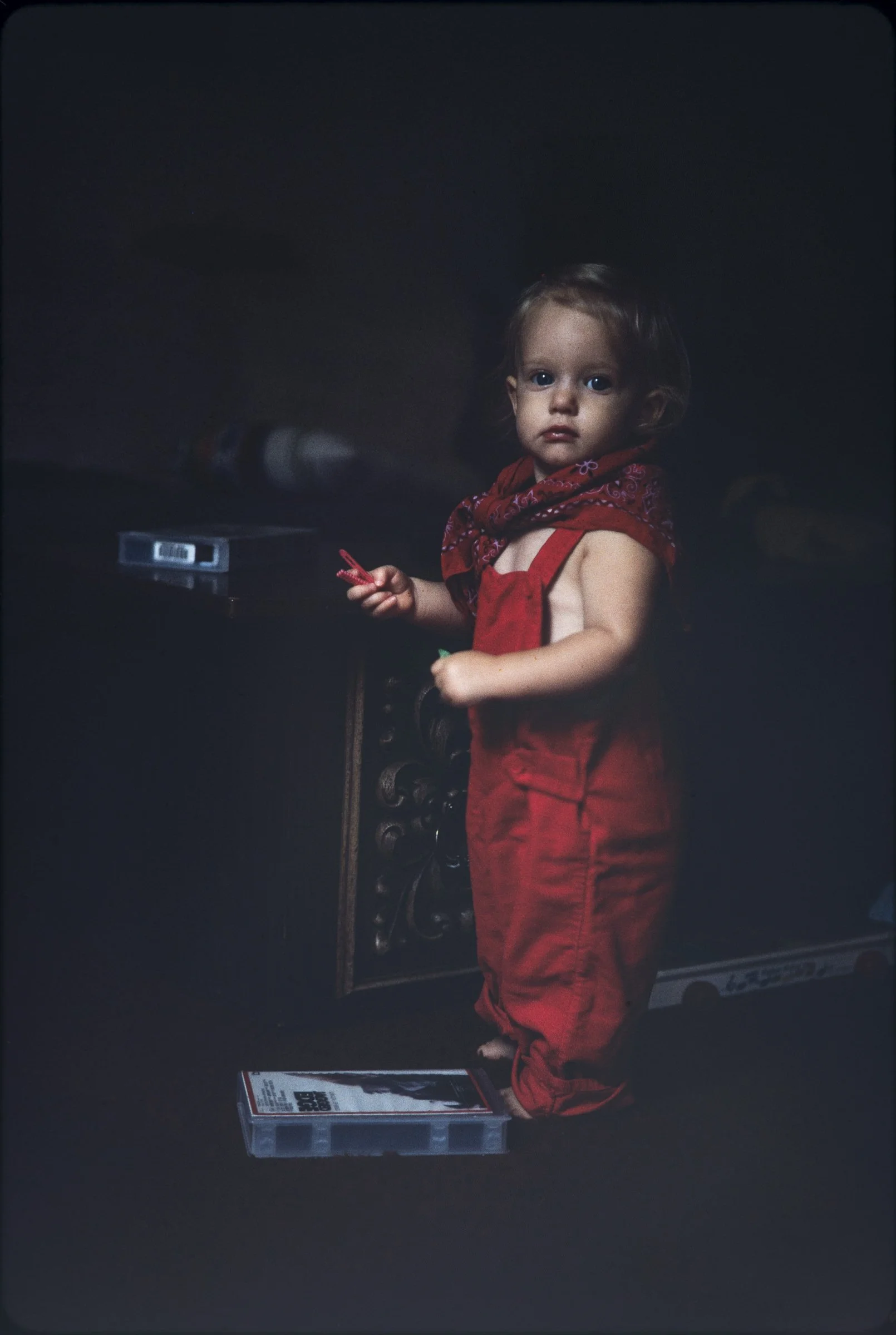 Young child in red overalls and a scarf holding a small object, next to a toy car and video cassette case.