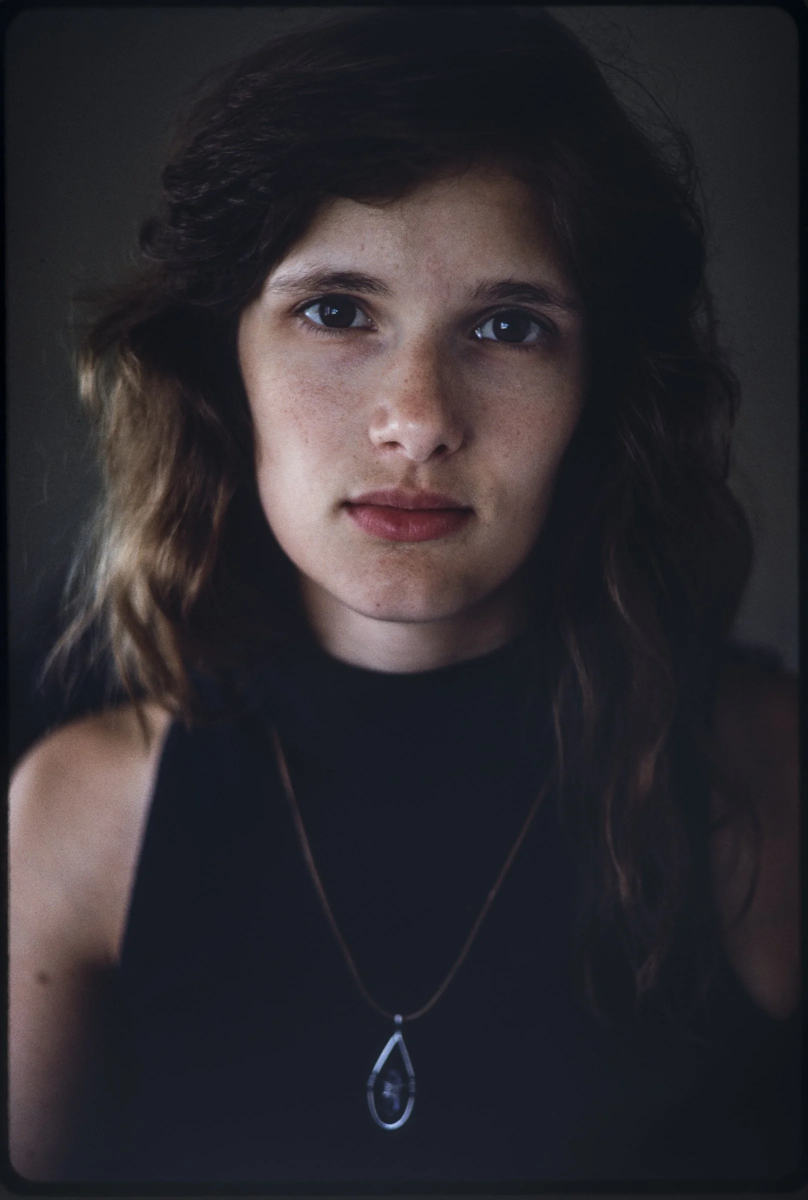 Portrait of a woman with wavy hair wearing a dark top and a pendant necklace. View fullsize
