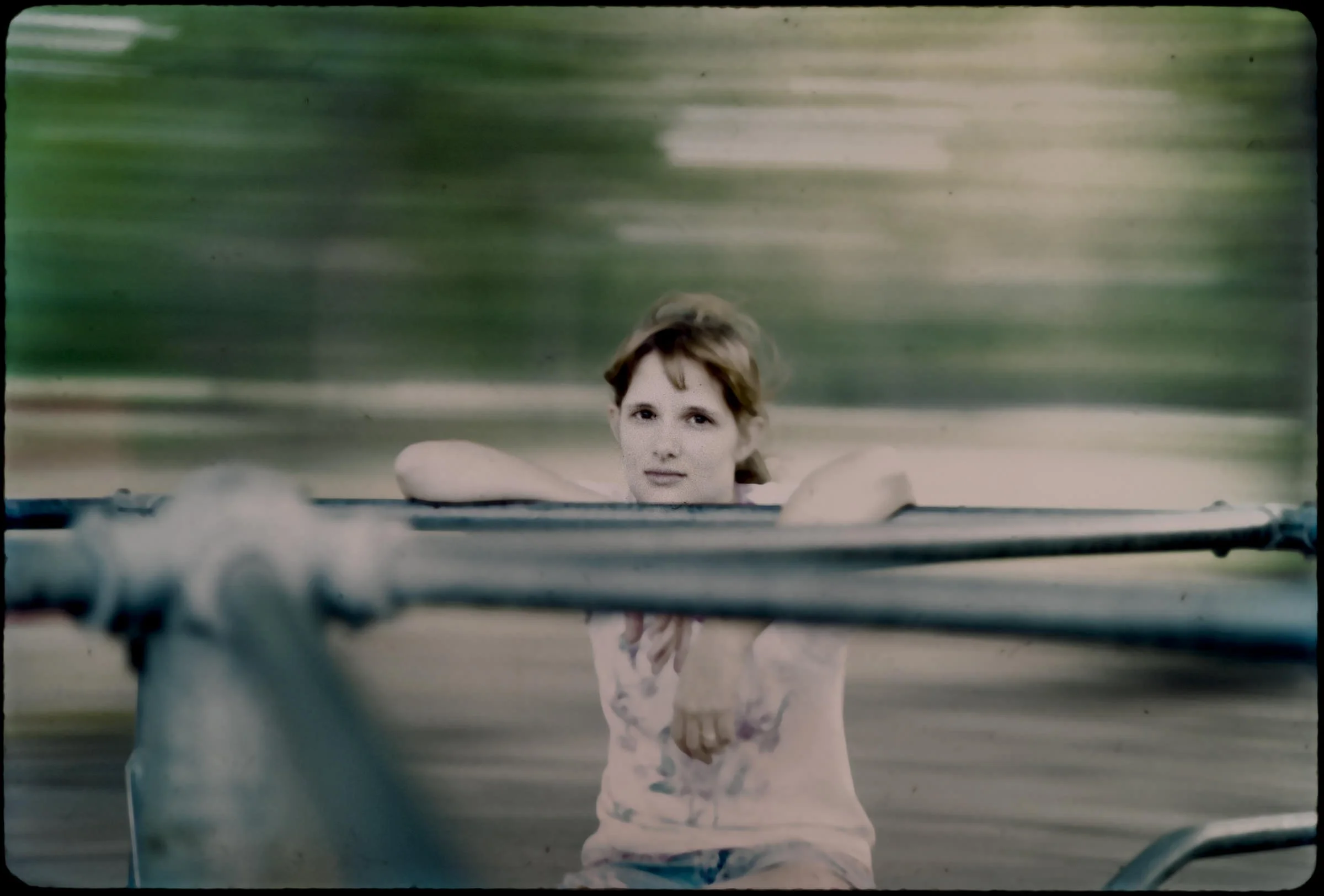 A person with short hair, resting arms on a merry-go-round, with a blurred background indicating motion. The scene appears playful and dynamic.