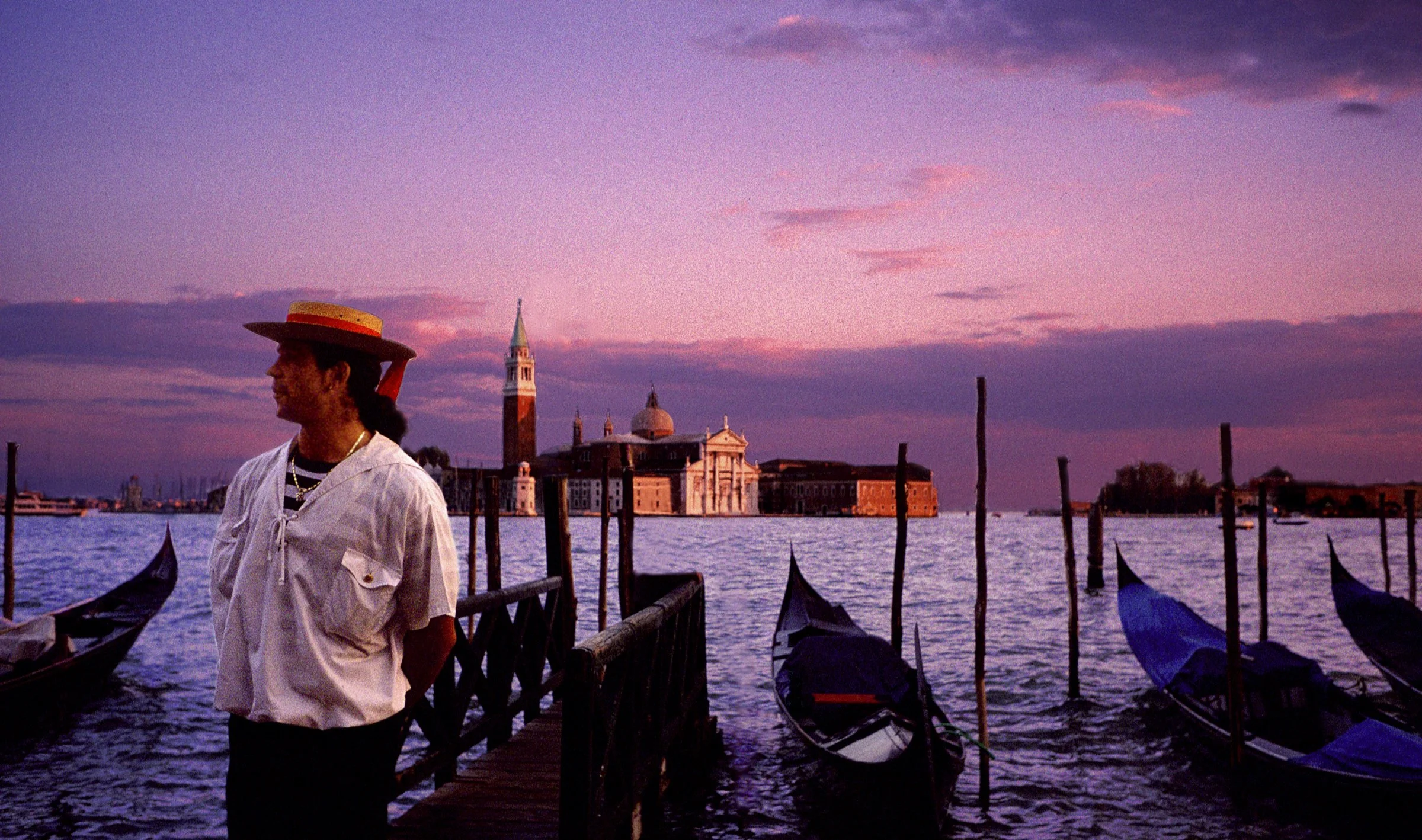 Gondolier standing on a dock with gondolas in Venice, Italy at sunset. San Giorgio Maggiore island and church in the background.