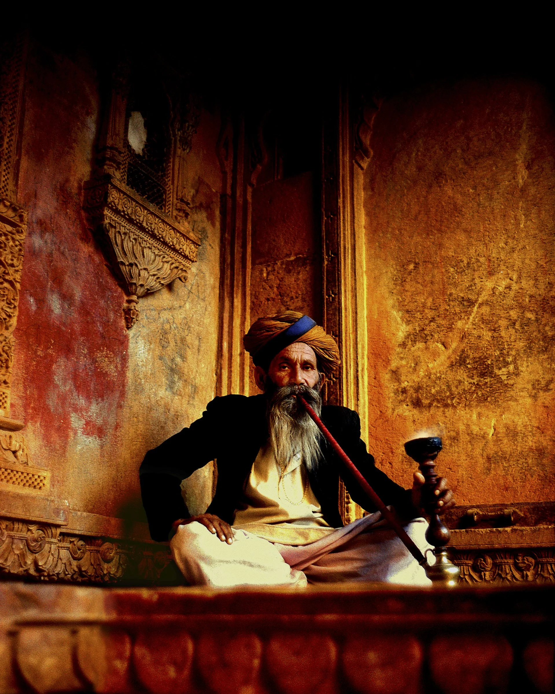 Elderly man in traditional attire sitting against ornate wall, holding a hookah. View fullsize