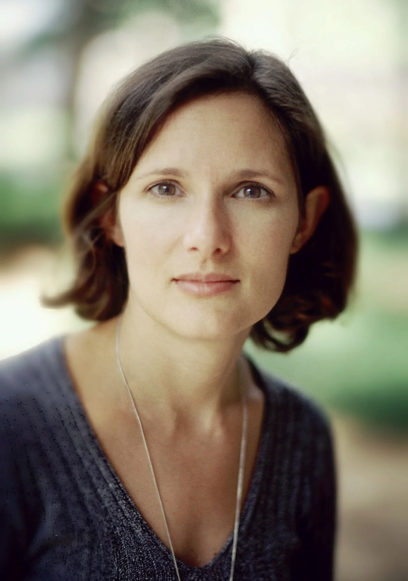 Portrait of a woman with short brown hair, wearing a gray top and a necklace, looking directly at the camera with a blurred background.