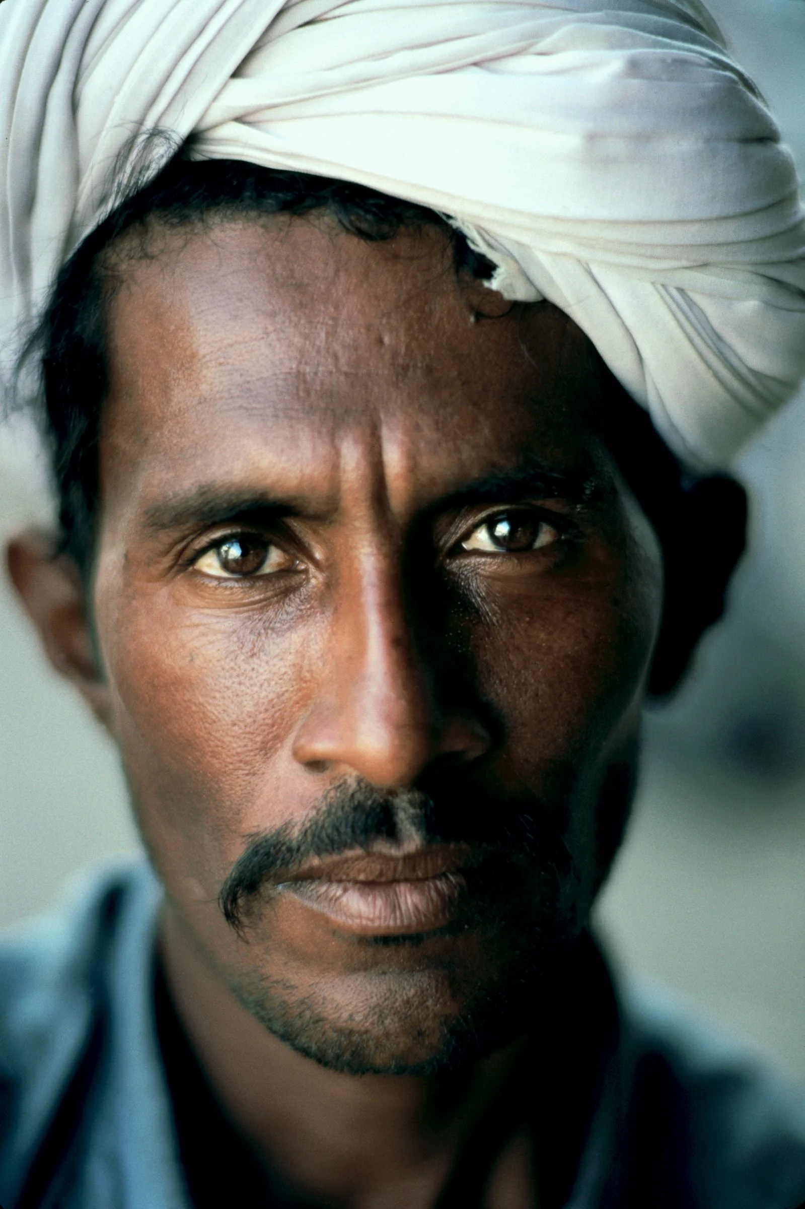 Close-up of a man with a mustache wearing a white turban. View fullsize