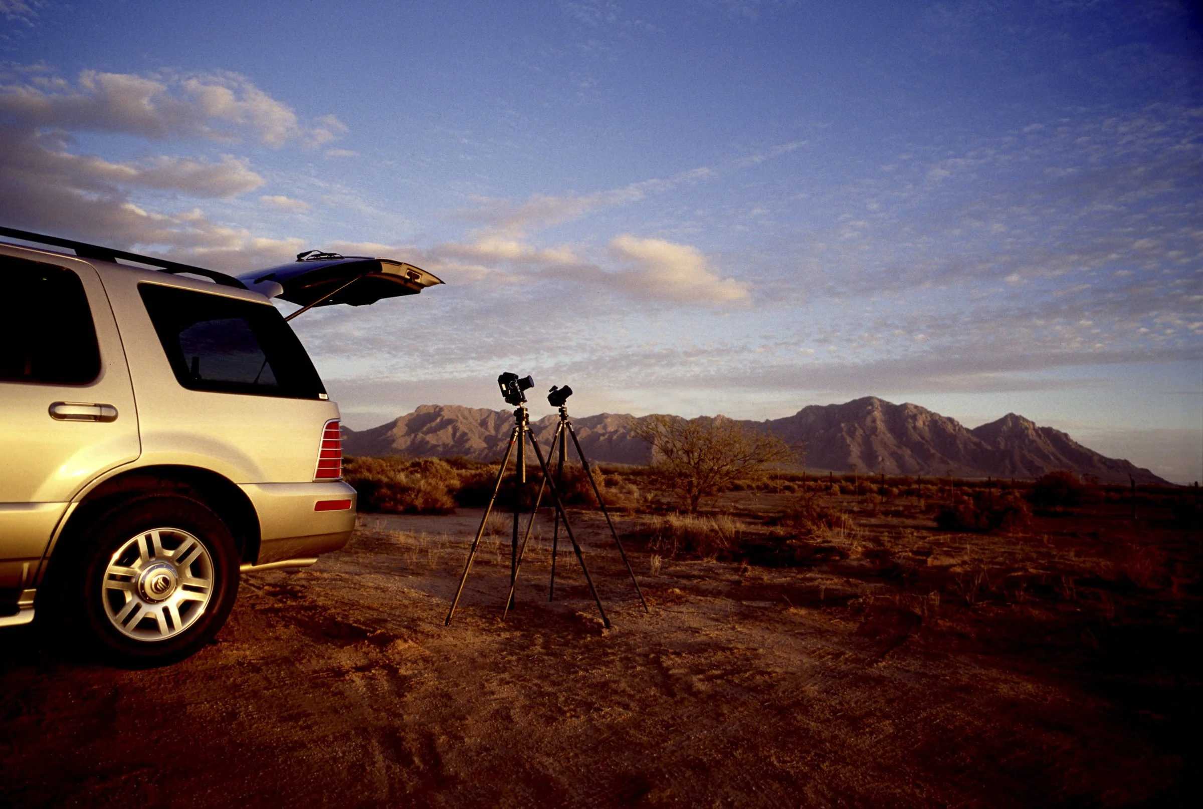 SUV parked with open hatchback, two tripods with cameras, desert landscape with mountains in background, blue sky with clouds. View fullsize
