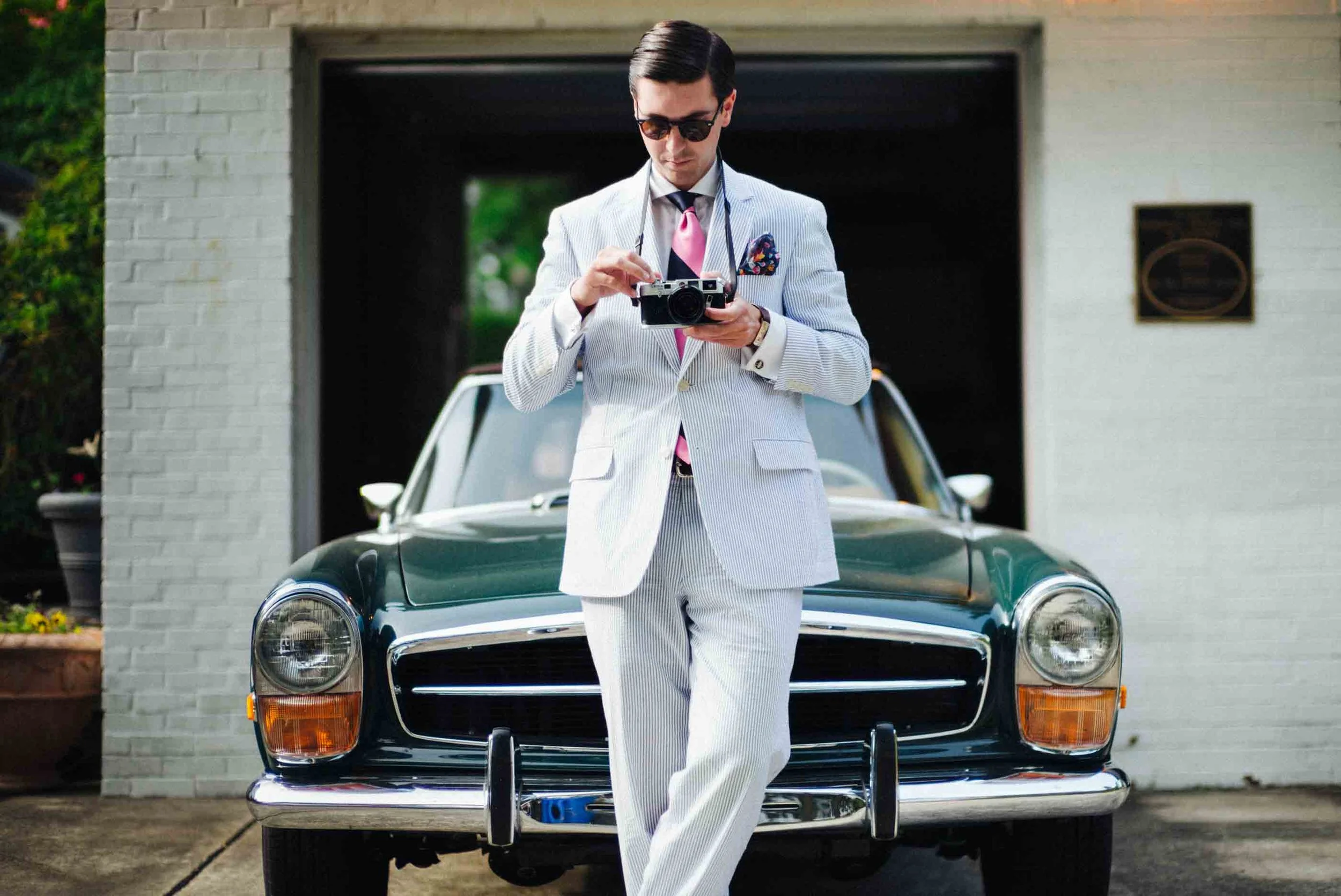 Man in a suit taking a photo with a Polaroid camera outdoors
