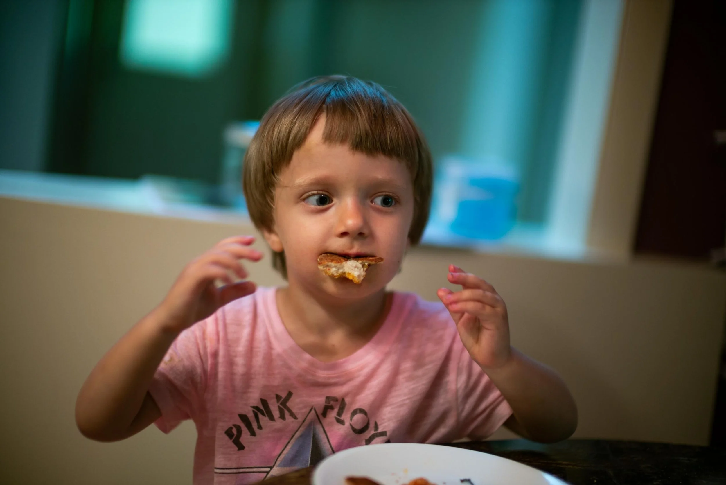 Young child wearing a Pink Floyd shirt, sitting at a table with food in their mouth, looking to the side.
