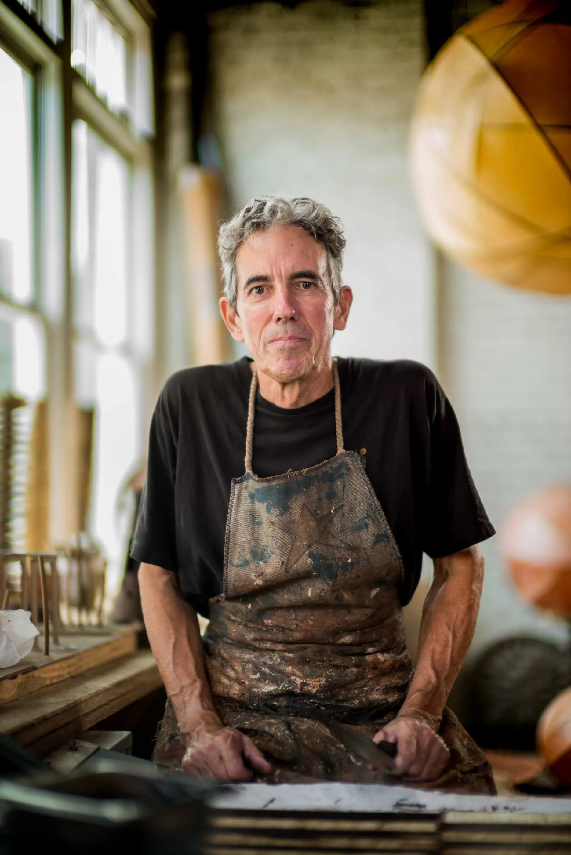 Bald man in a suit sitting in a modern office with green chairs and large windows.
