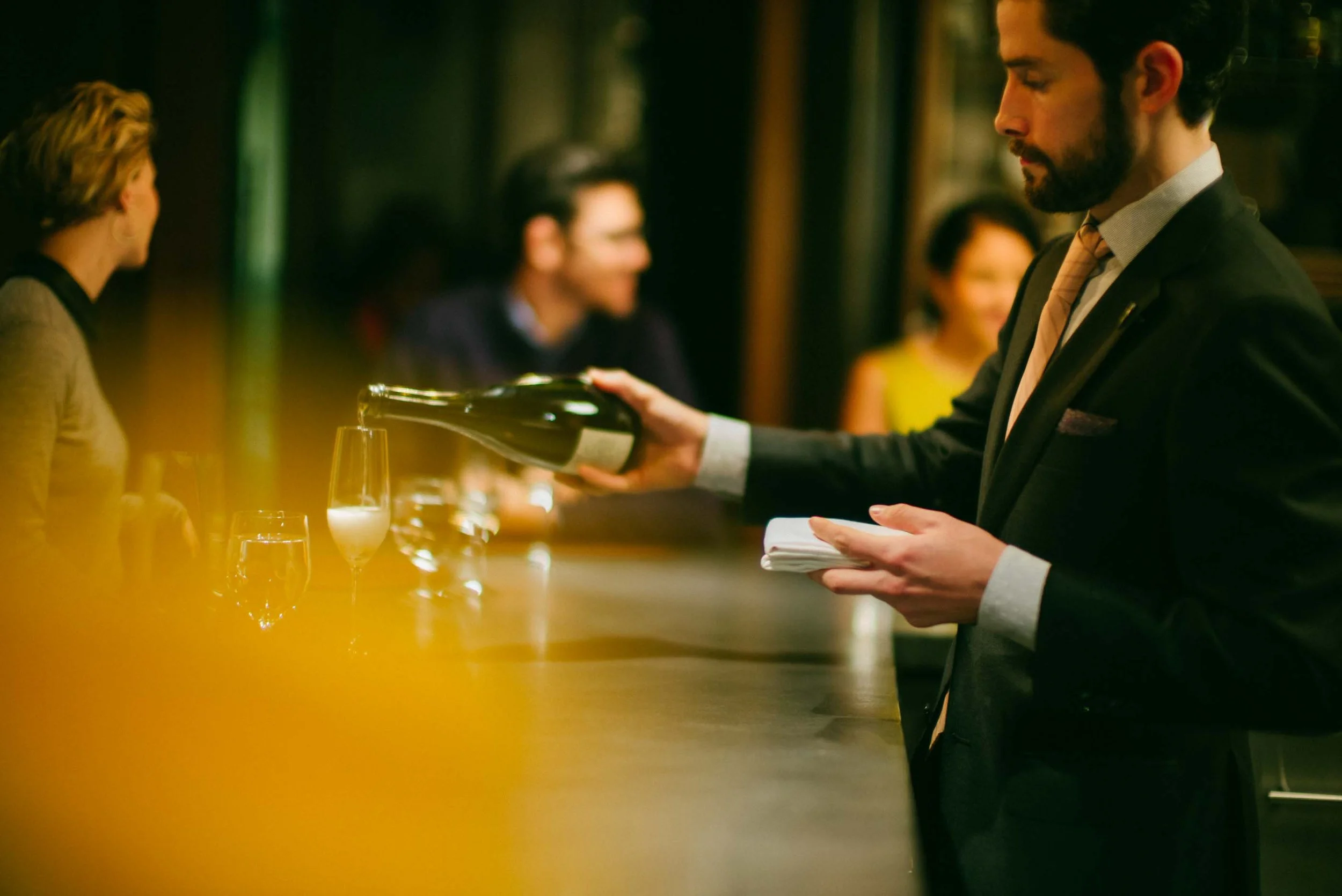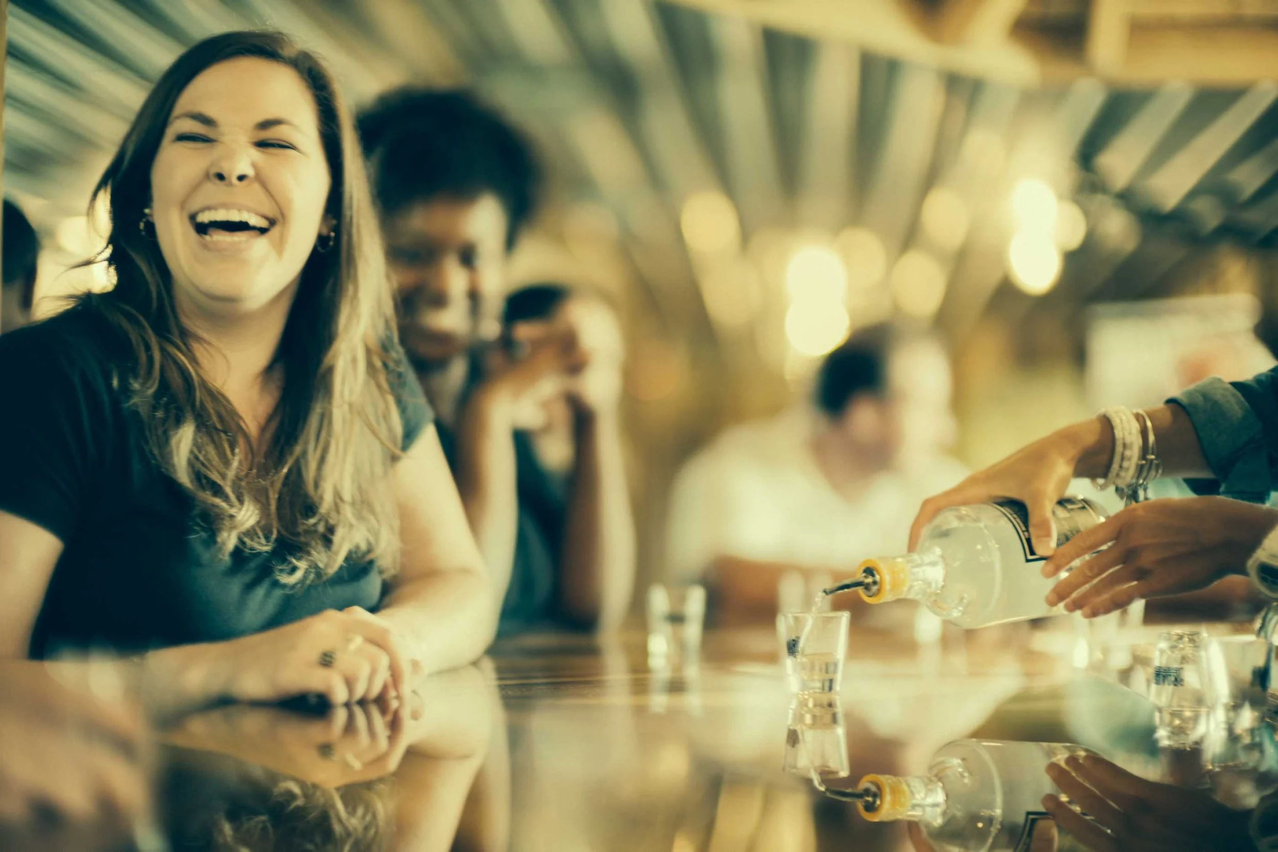 People enjoying a drink at a bar, with someone pouring a beverage into shot glasses.