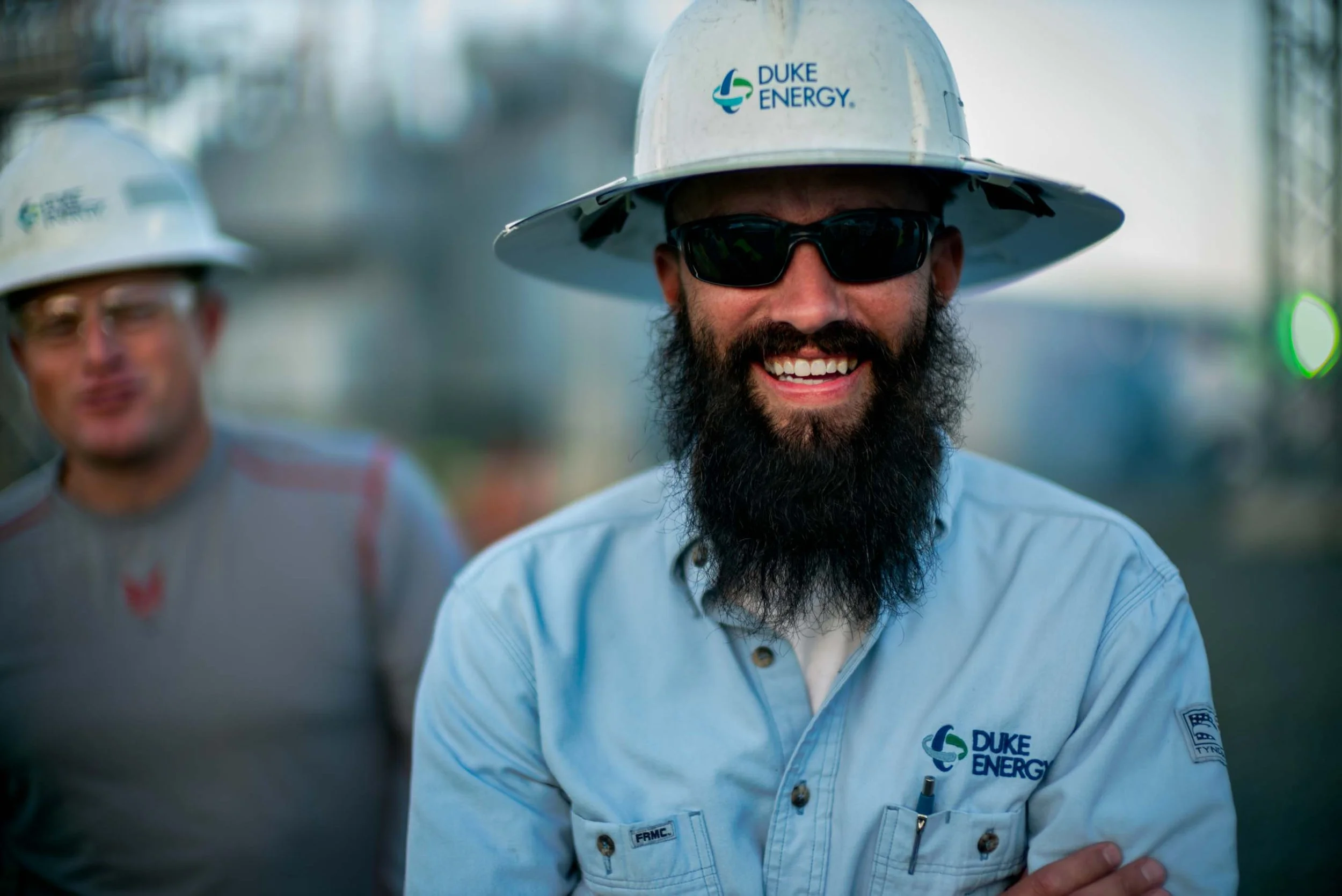 Utility worker wearing safety gear, hard hat, and harness, standing near utility truck with cloudy sky background.