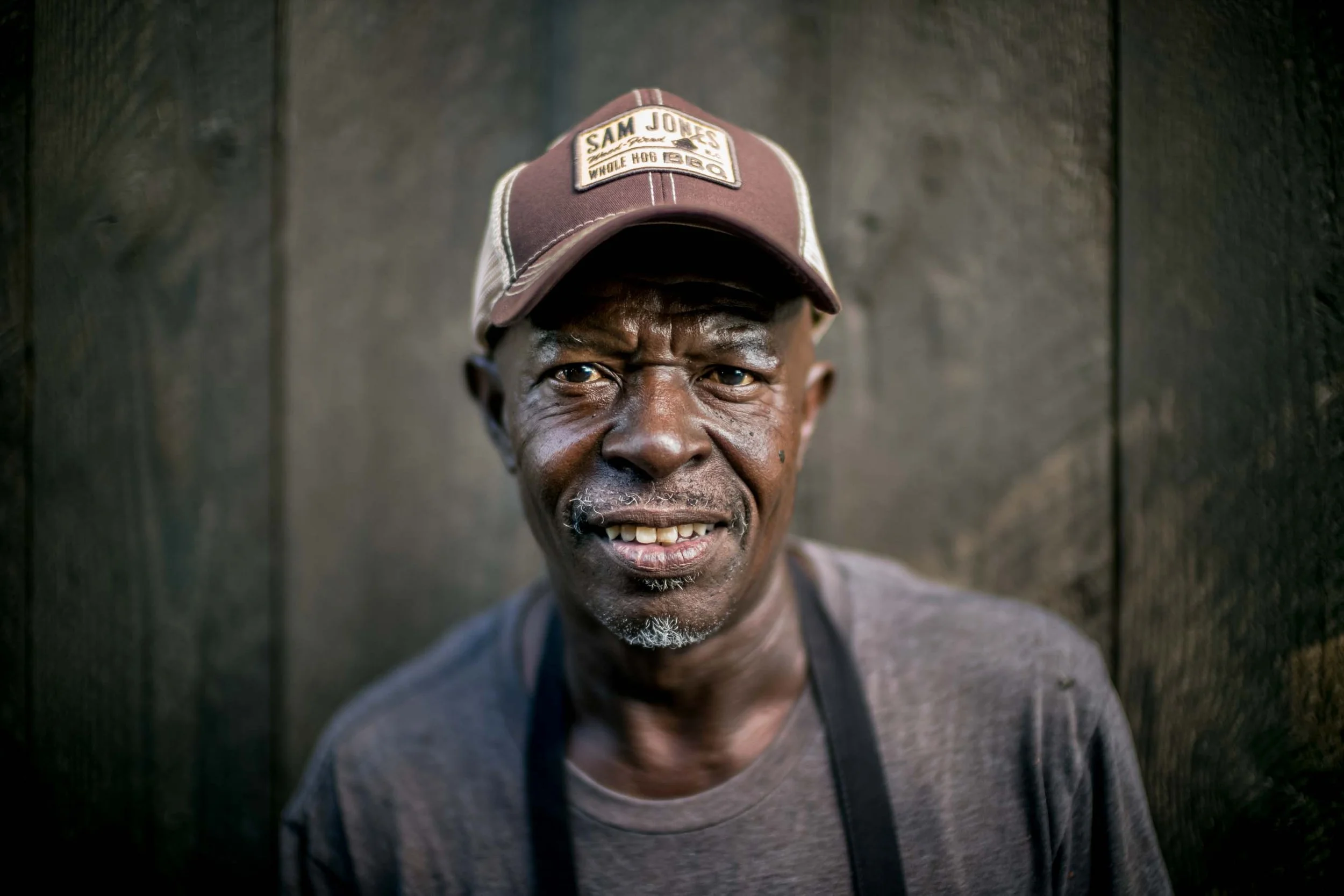 Smiling man wearing a "Sam Jones Barbecue" cap standing against a wooden background.