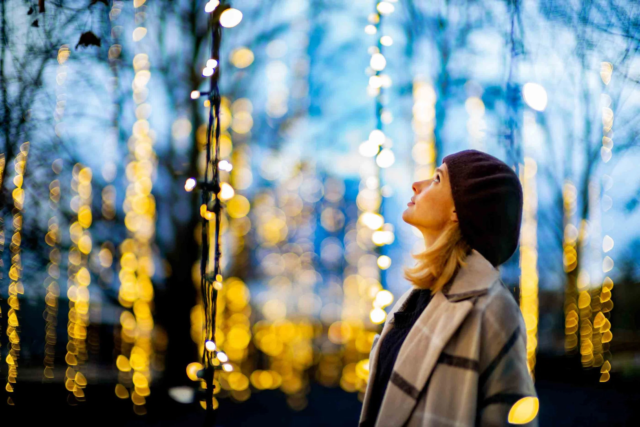 Woman in a coat and beret looking at string lights outdoors with blurred bokeh effect.