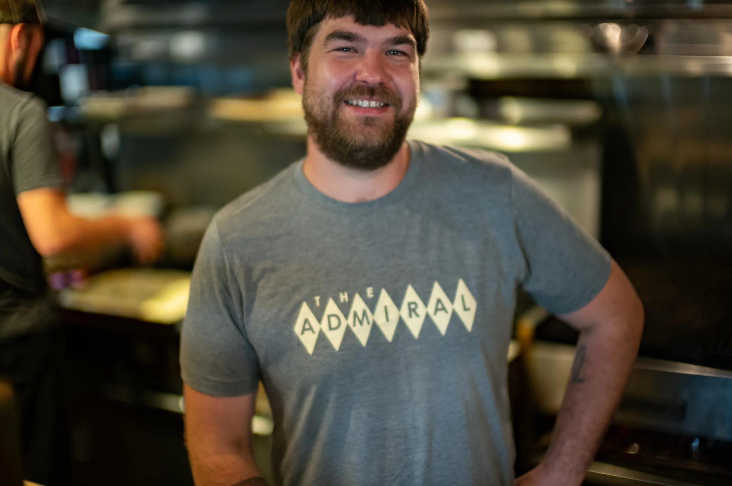 Smiling man wearing a gray T-shirt with the words 'The Admiral' in a kitchen setting.