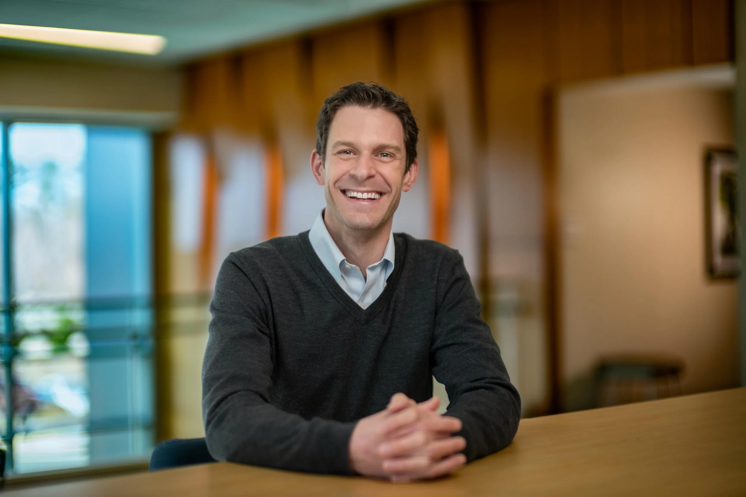 Man smiling, seated at a table in a modern office setting with blurred background.