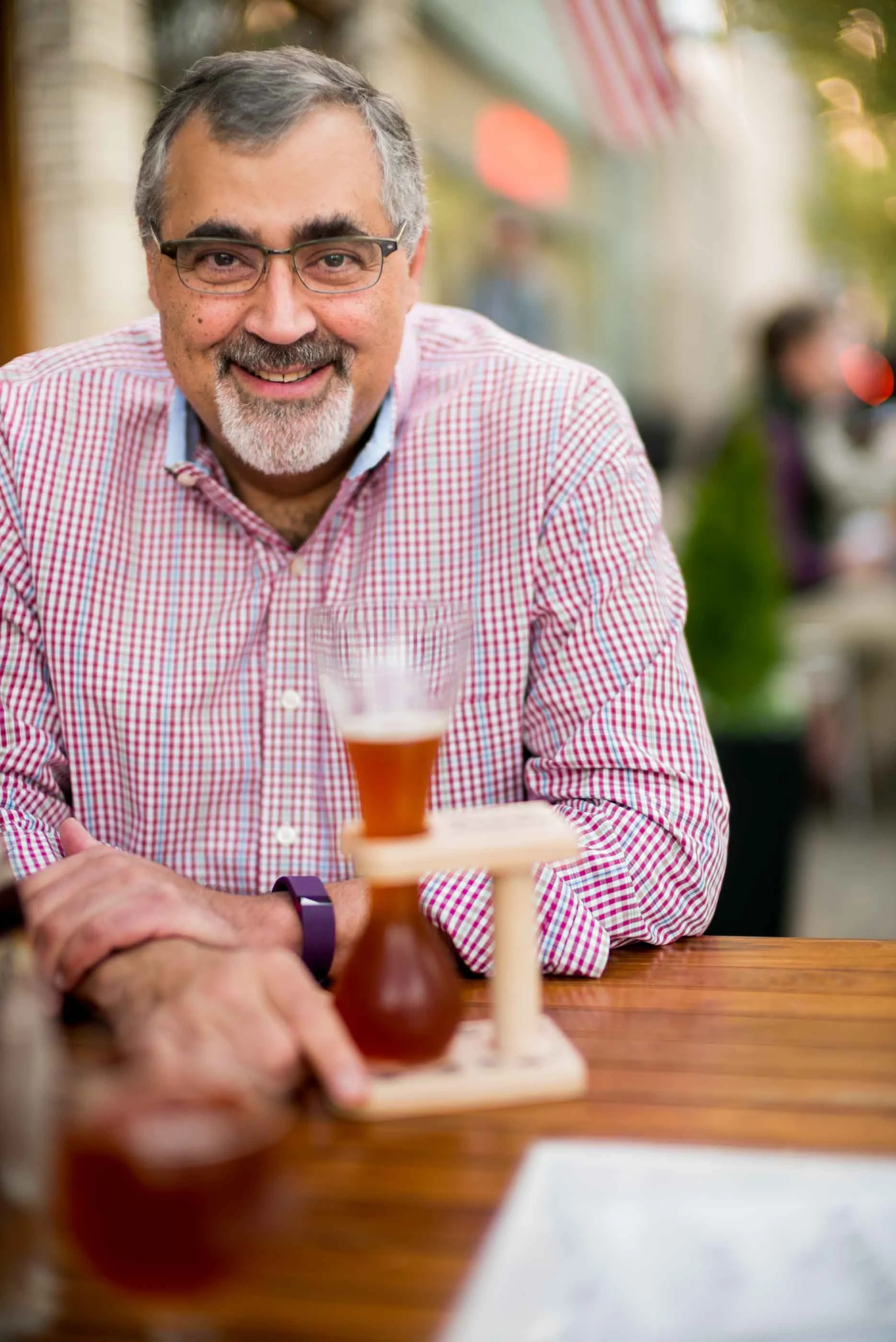 Man wearing glasses and a checked shirt smiling while sitting at an outdoor table with a beer in front of him.