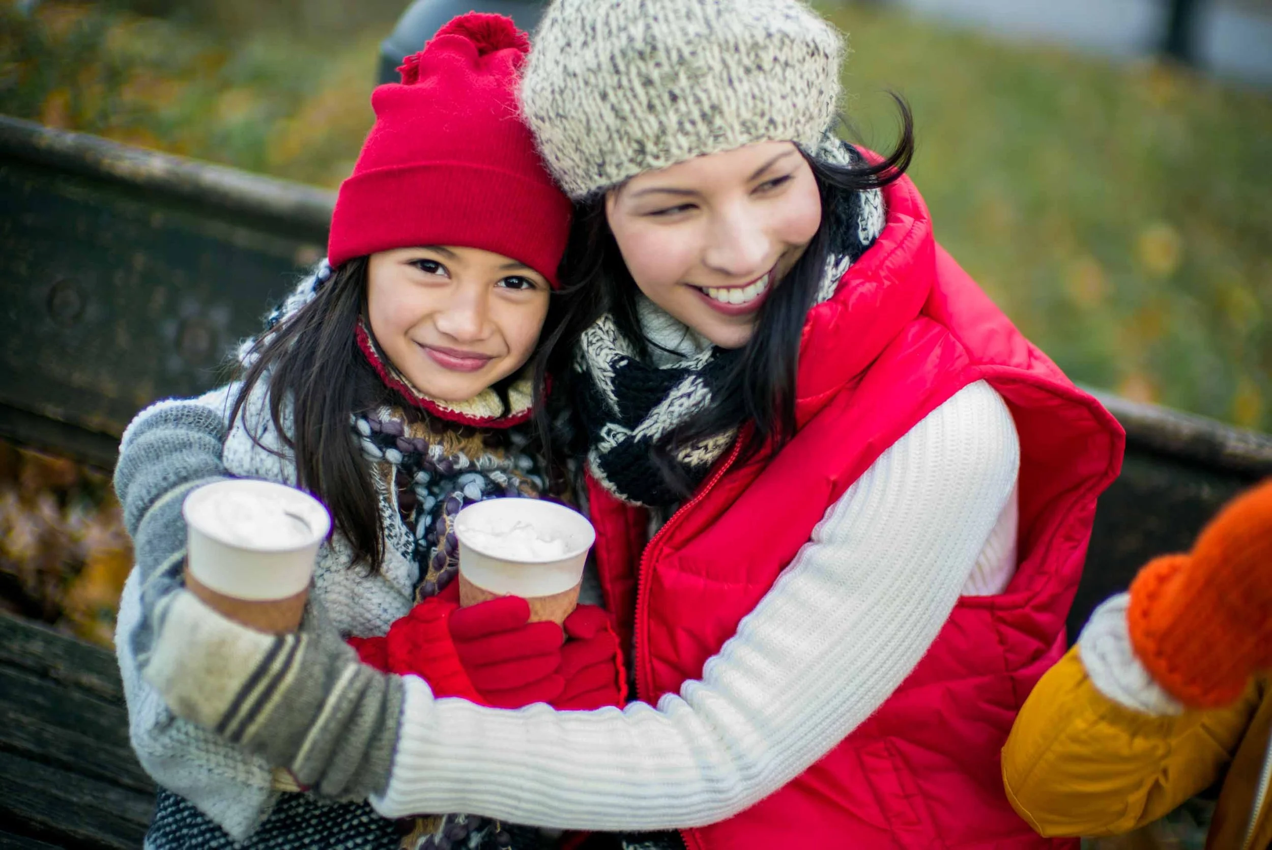 Two people wearing winter clothing, including hats and scarves, smiling and holding hot beverages on a park bench.