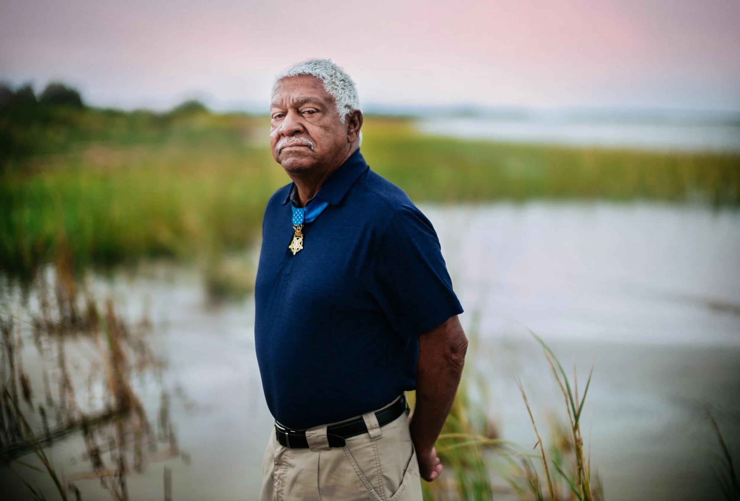 Elderly man wearing a blue shirt and Medal of Honor, standing by a serene lake with tall grass.