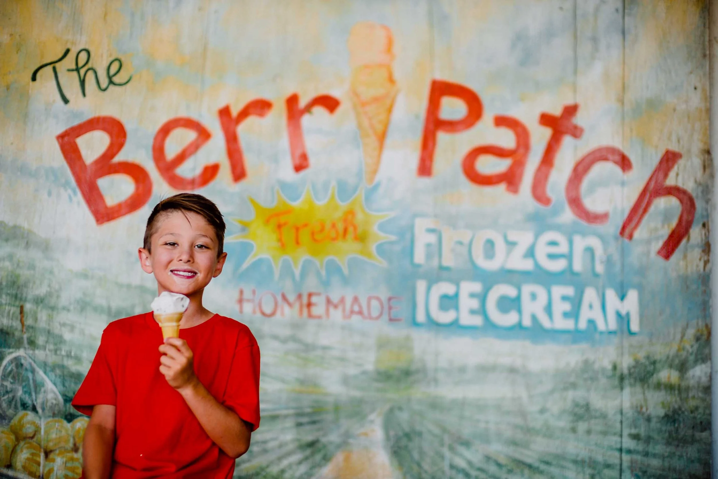 Child in red shirt holding an ice cream cone in front of "The Berry Patch" sign advertising fresh homemade frozen ice cream.