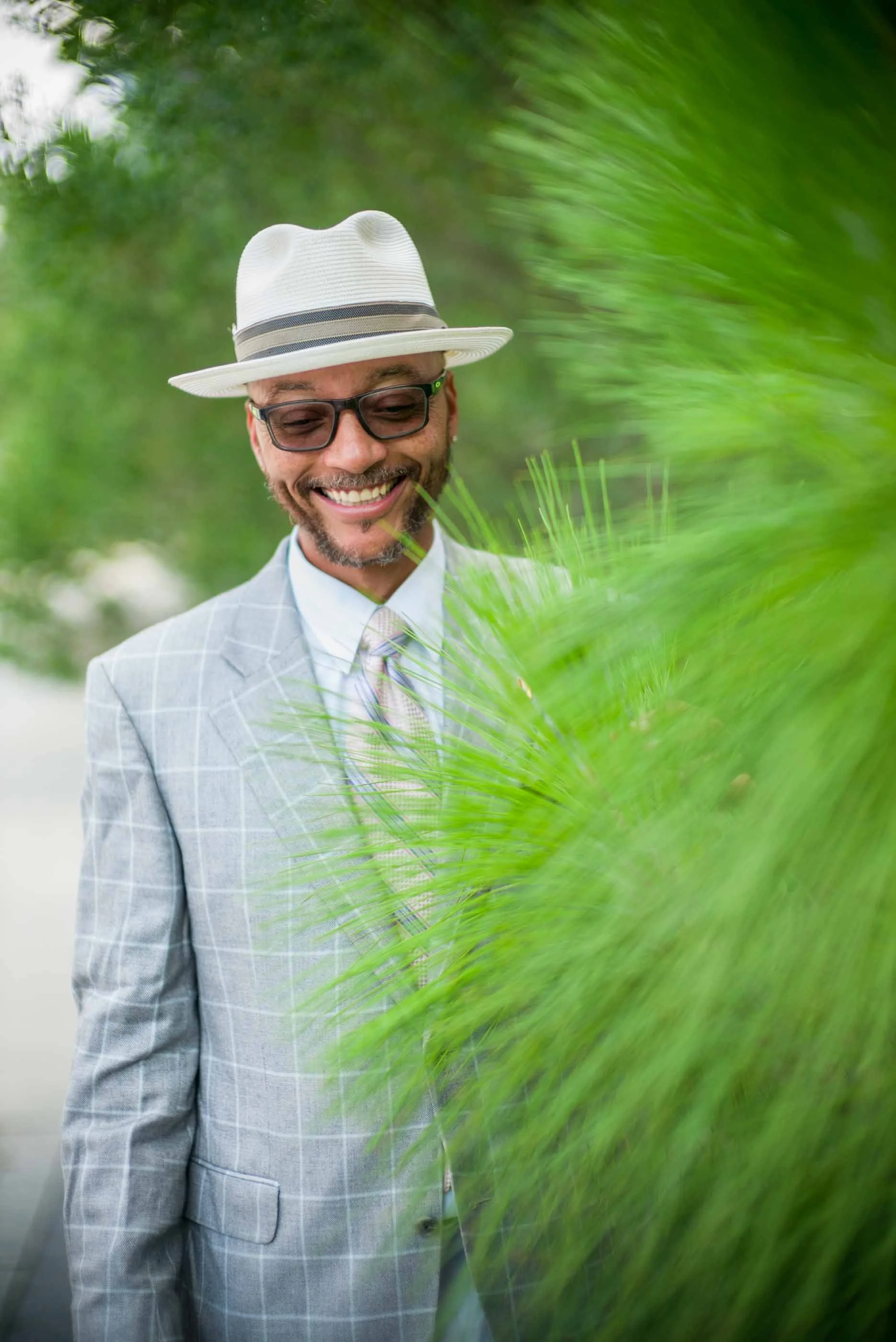 Man in a suit smiling while dining at a restaurant with a blurred green background.