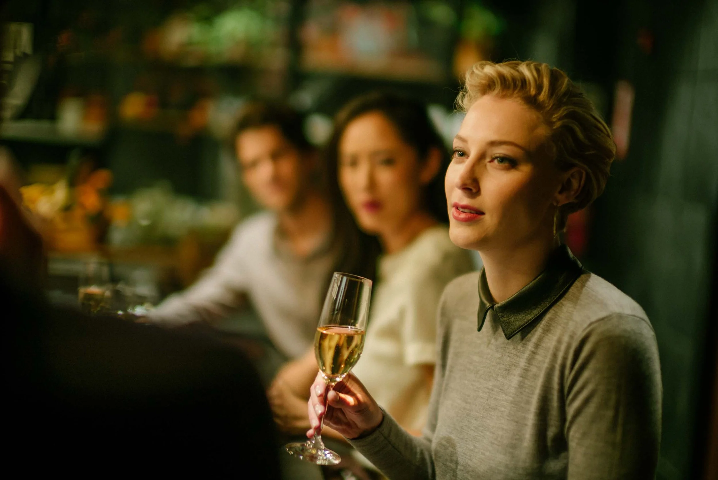 Woman in yellow dress smiling at a table with wine glasses in dimly lit setting.