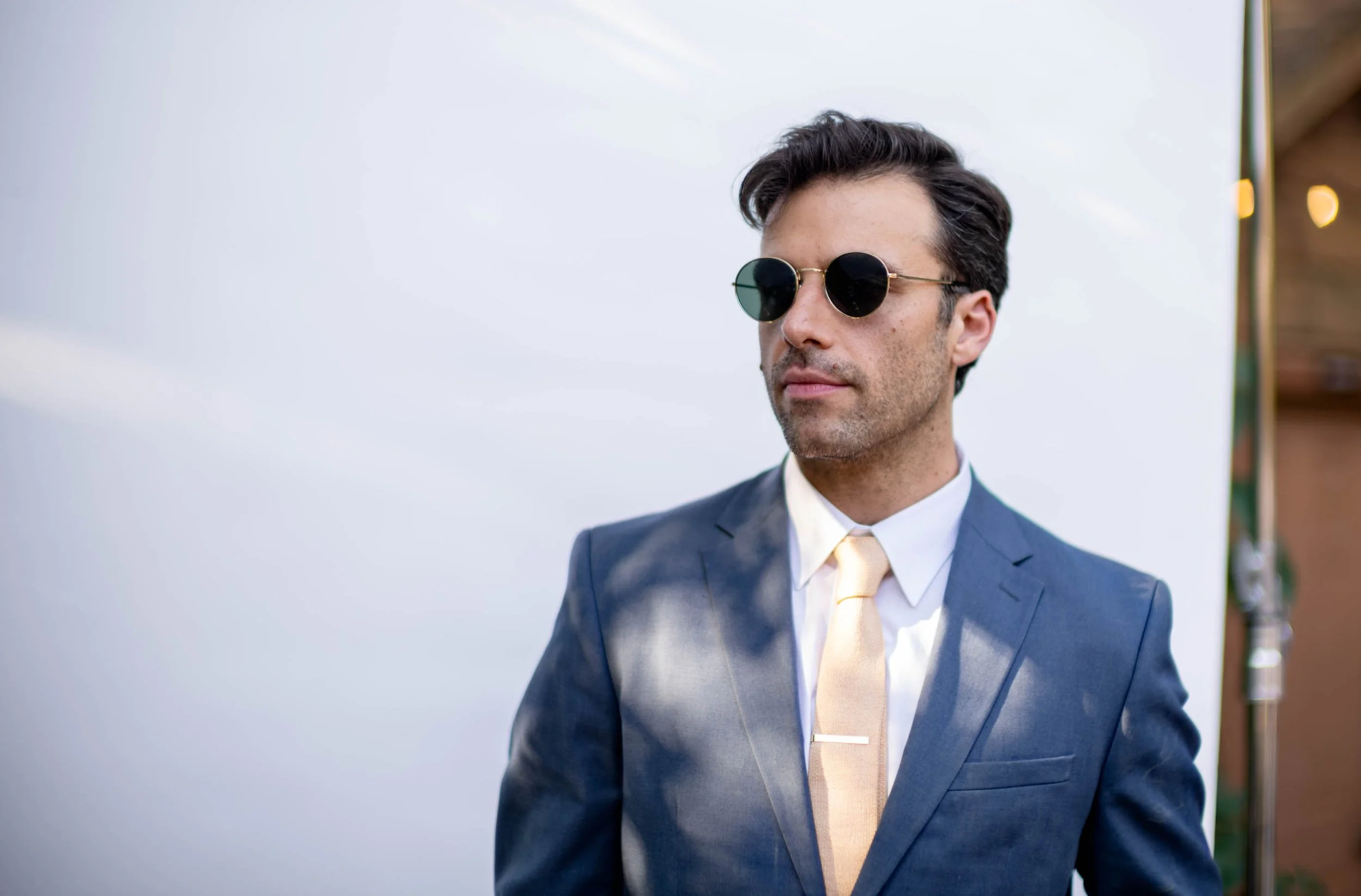 Man in blue suit wearing sunglasses and a yellow tie standing outdoors.