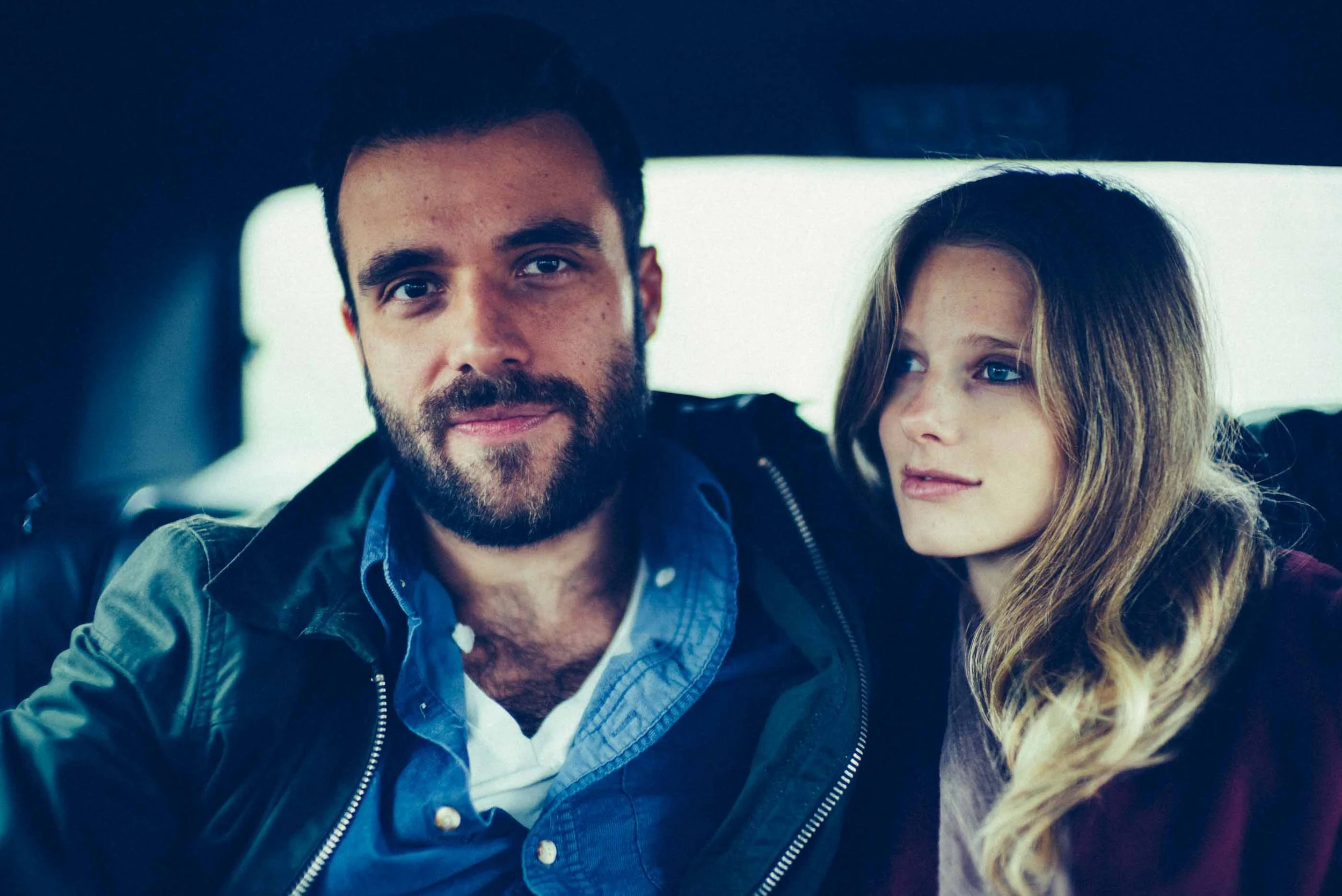 A man with a beard and a woman sitting in a car, the man wearing a jacket and shirt, the woman looking at him.